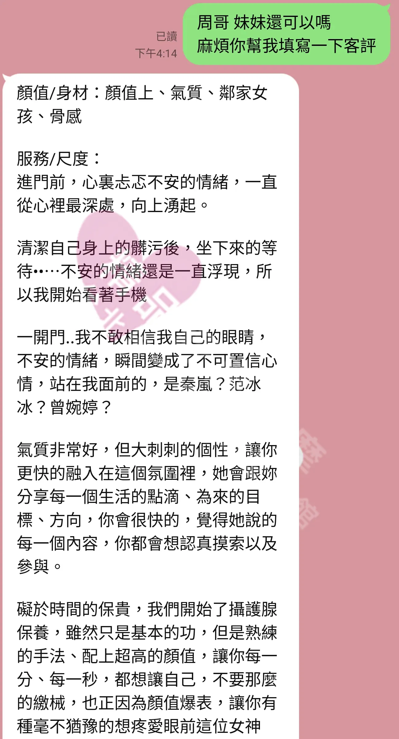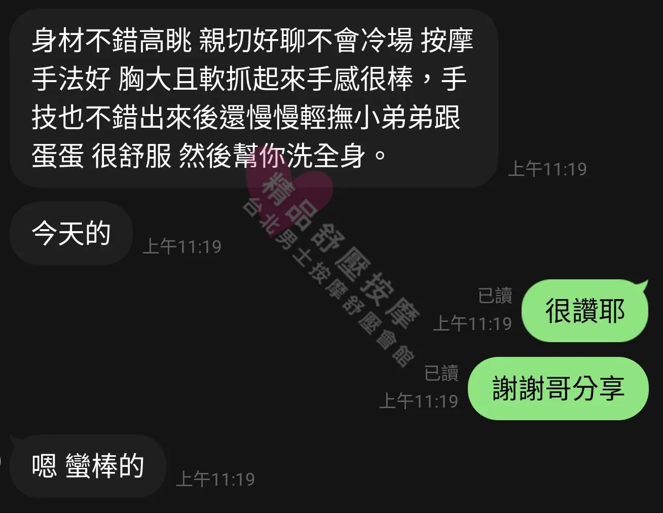 美容師都很有禮貌,先幫你背部按摩聊聊天,前戲會開始調情輕功,再來就是重點部位的加強。如果預算,也可以跟美容師聊聊加值服務,放心問都有機會。精品舒壓期待每位客人每次來舒壓都有個Happy Ending!