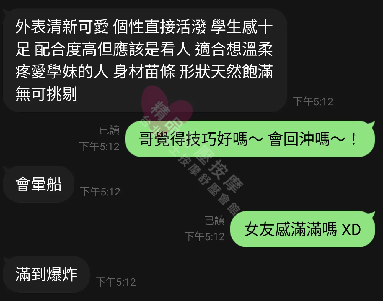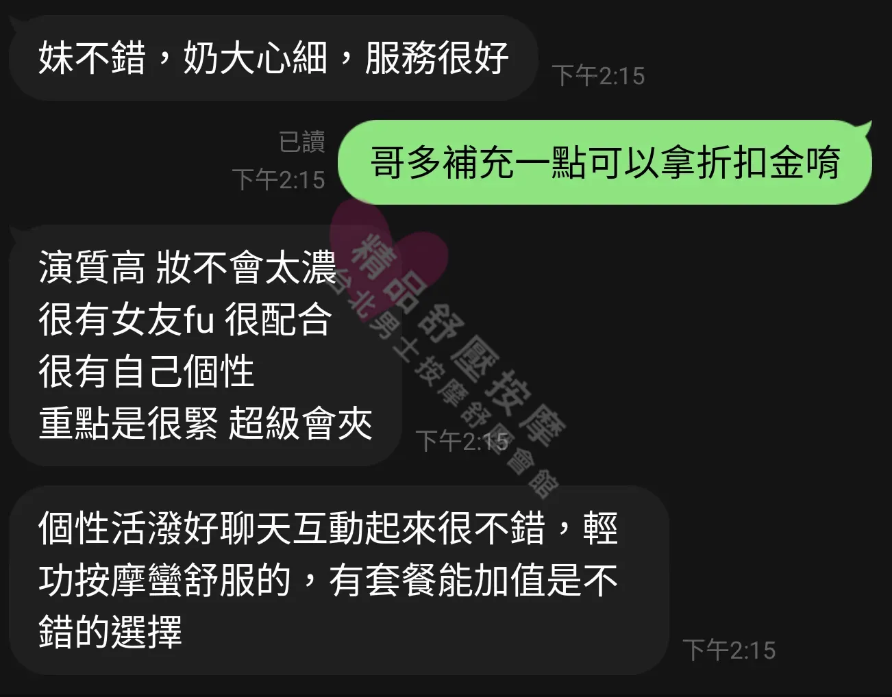 美容師都很有禮貌,先幫你背部按摩聊聊天,前戲會開始調情輕功,再來就是重點部位的加強。如果預算,也可以跟美容師聊聊加值服務,放心問都有機會。精品舒壓期待每位客人每次來舒壓都有個Happy Ending!