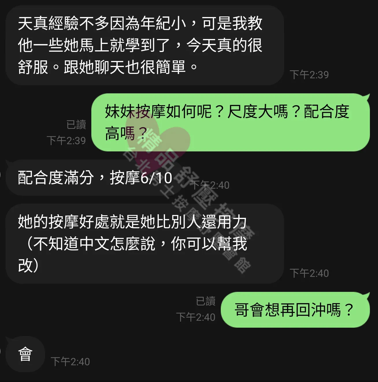 美容師都很有禮貌,先幫你背部按摩聊聊天,前戲會開始調情輕功,再來就是重點部位的加強。如果預算,也可以跟美容師聊聊加值服務,放心問都有機會。精品舒壓期待每位客人每次來舒壓都有個Happy Ending!