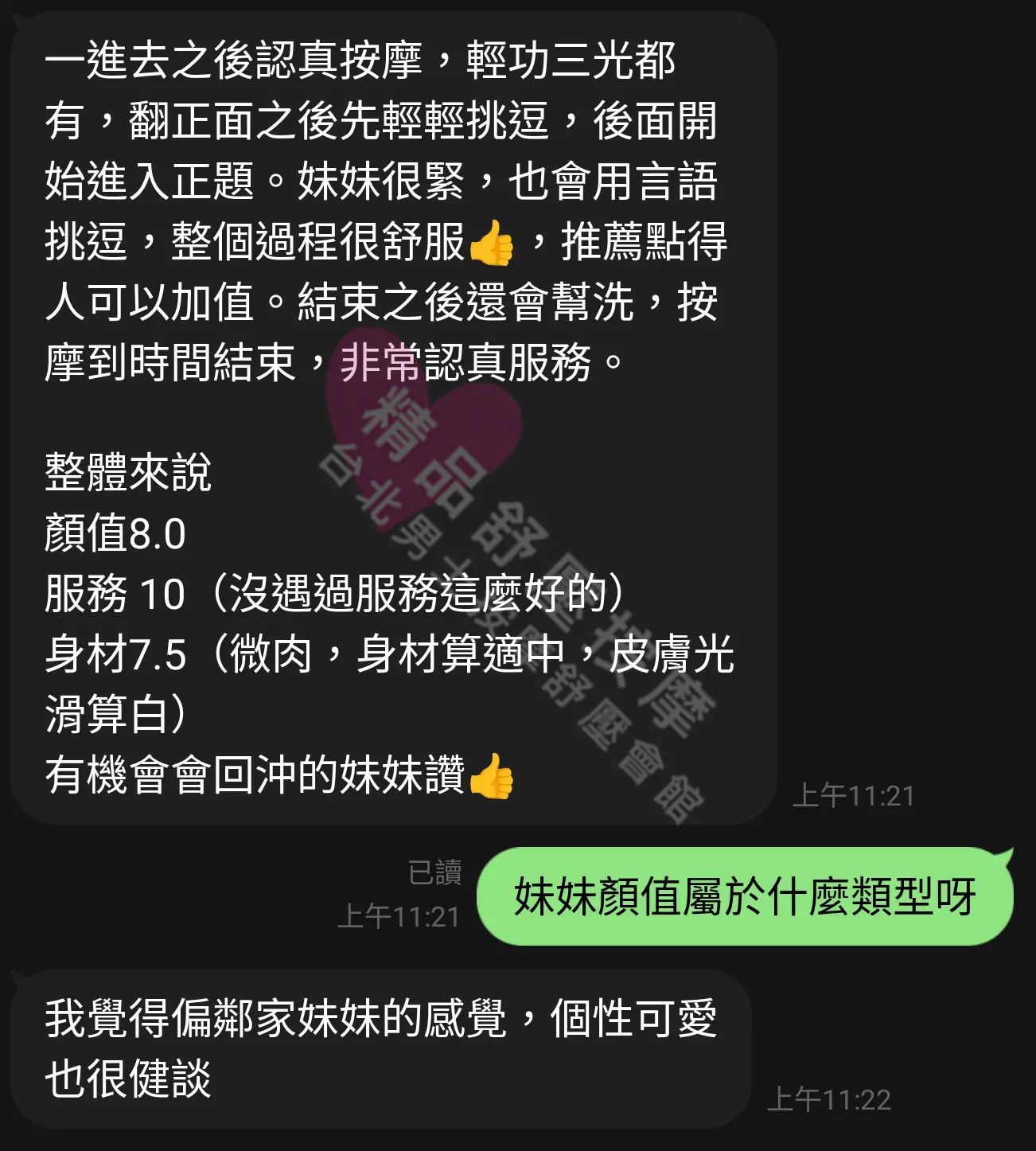 美容師都很有禮貌,先幫你背部按摩聊聊天,前戲會開始調情輕功,再來就是重點部位的加強。如果預算,也可以跟美容師聊聊加值服務,放心問都有機會。精品舒壓期待每位客人每次來舒壓都有個Happy Ending!