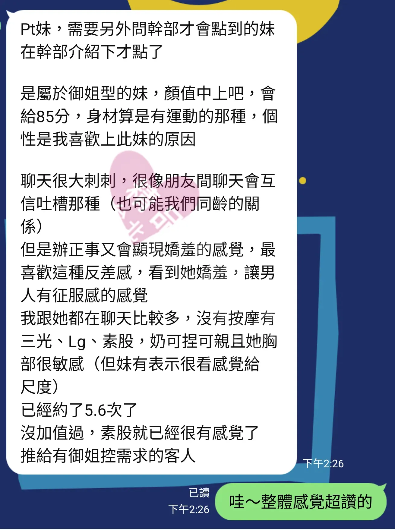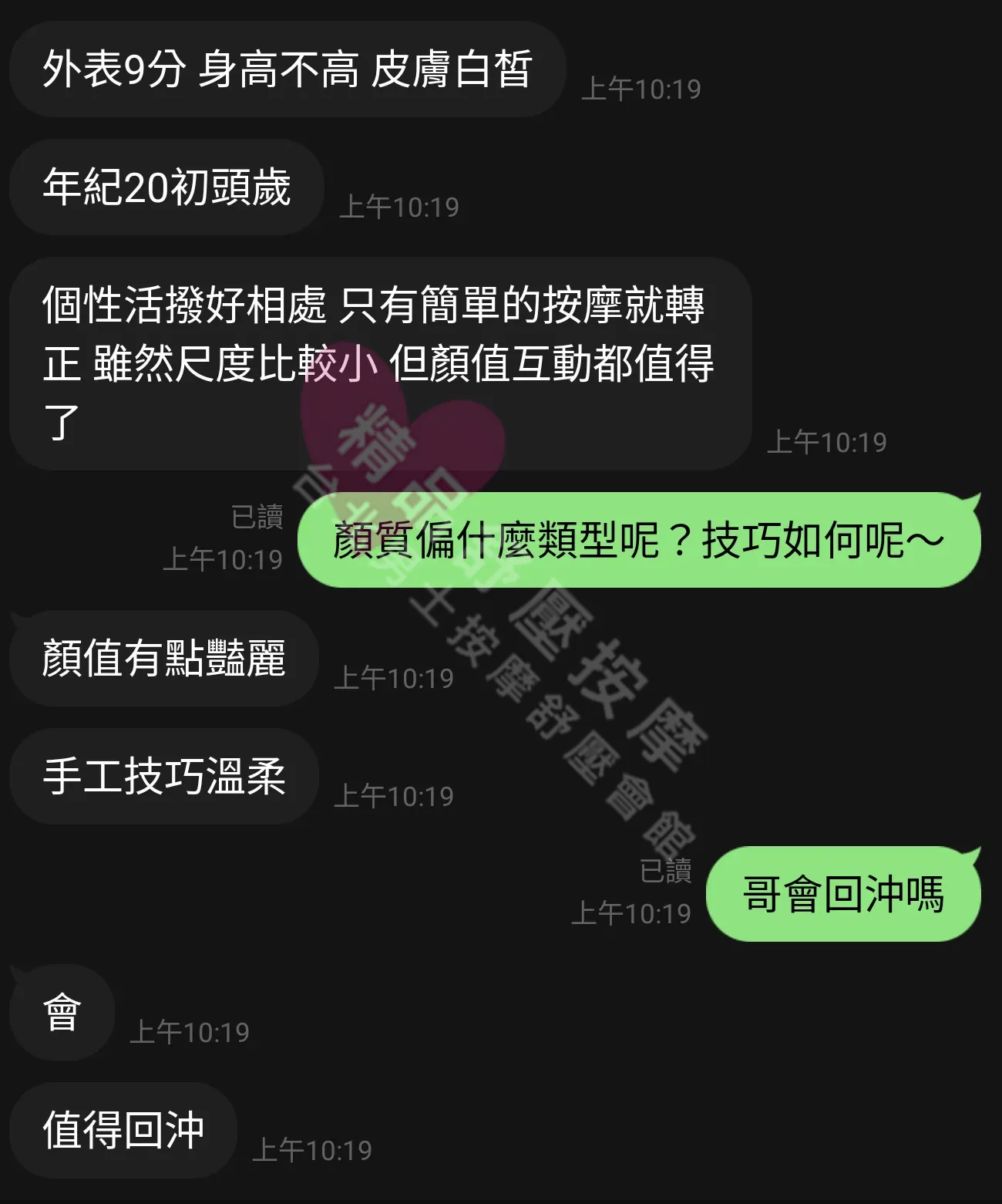 美容師都很有禮貌,先幫你背部按摩聊聊天,前戲會開始調情輕功,再來就是重點部位的加強。如果預算,也可以跟美容師聊聊加值服務,放心問都有機會。精品舒壓期待每位客人每次來舒壓都有個Happy Ending!