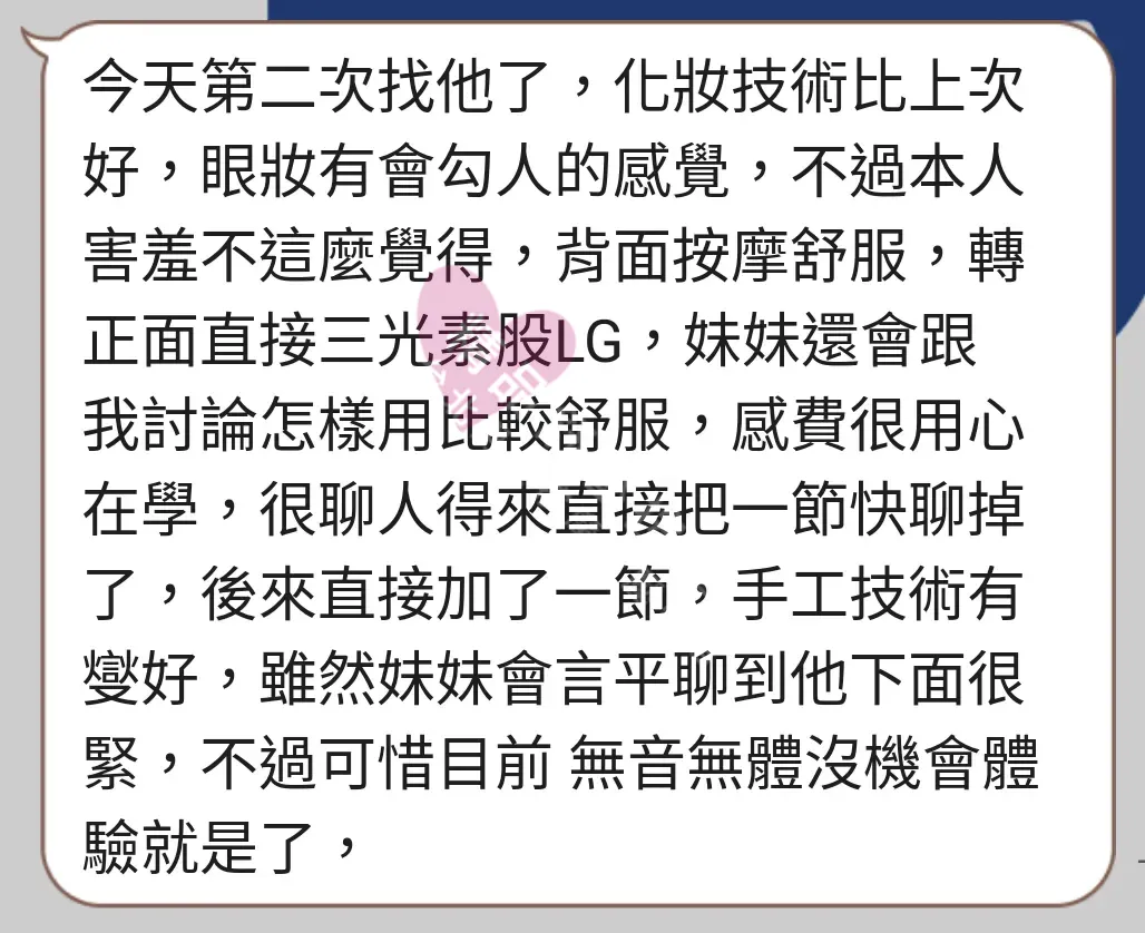 美容師都很有禮貌,先幫你背部按摩聊聊天,前戲會開始調情輕功,再來就是重點部位的加強。如果預算,也可以跟美容師聊聊加值服務,放心問都有機會。精品舒壓期待每位客人每次來舒壓都有個Happy Ending!