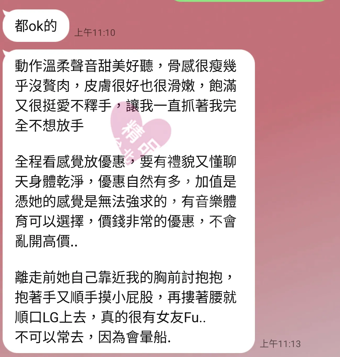 美容師都很有禮貌,先幫你背部按摩聊聊天,前戲會開始調情輕功,再來就是重點部位的加強。如果預算,也可以跟美容師聊聊加值服務,放心問都有機會。精品舒壓期待每位客人每次來舒壓都有個Happy Ending!