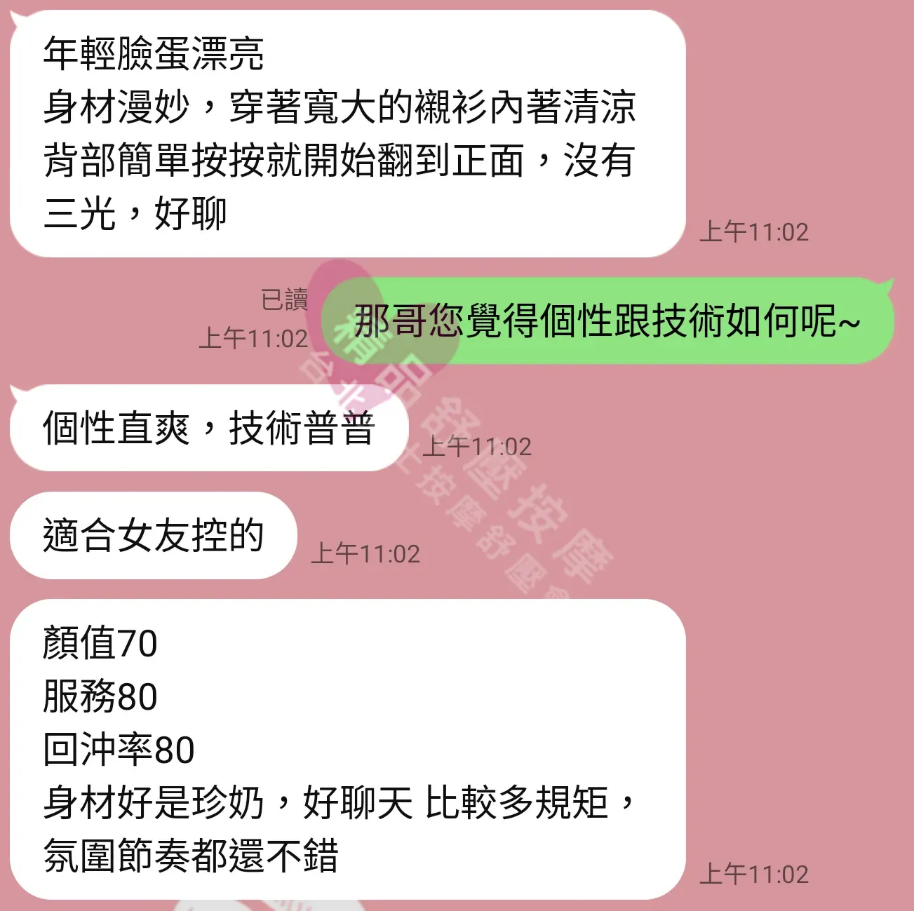 美容師都很有禮貌,先幫你背部按摩聊聊天,前戲會開始調情輕功,再來就是重點部位的加強。如果預算,也可以跟美容師聊聊加值服務,放心問都有機會。精品舒壓期待每位客人每次來舒壓都有個Happy Ending!