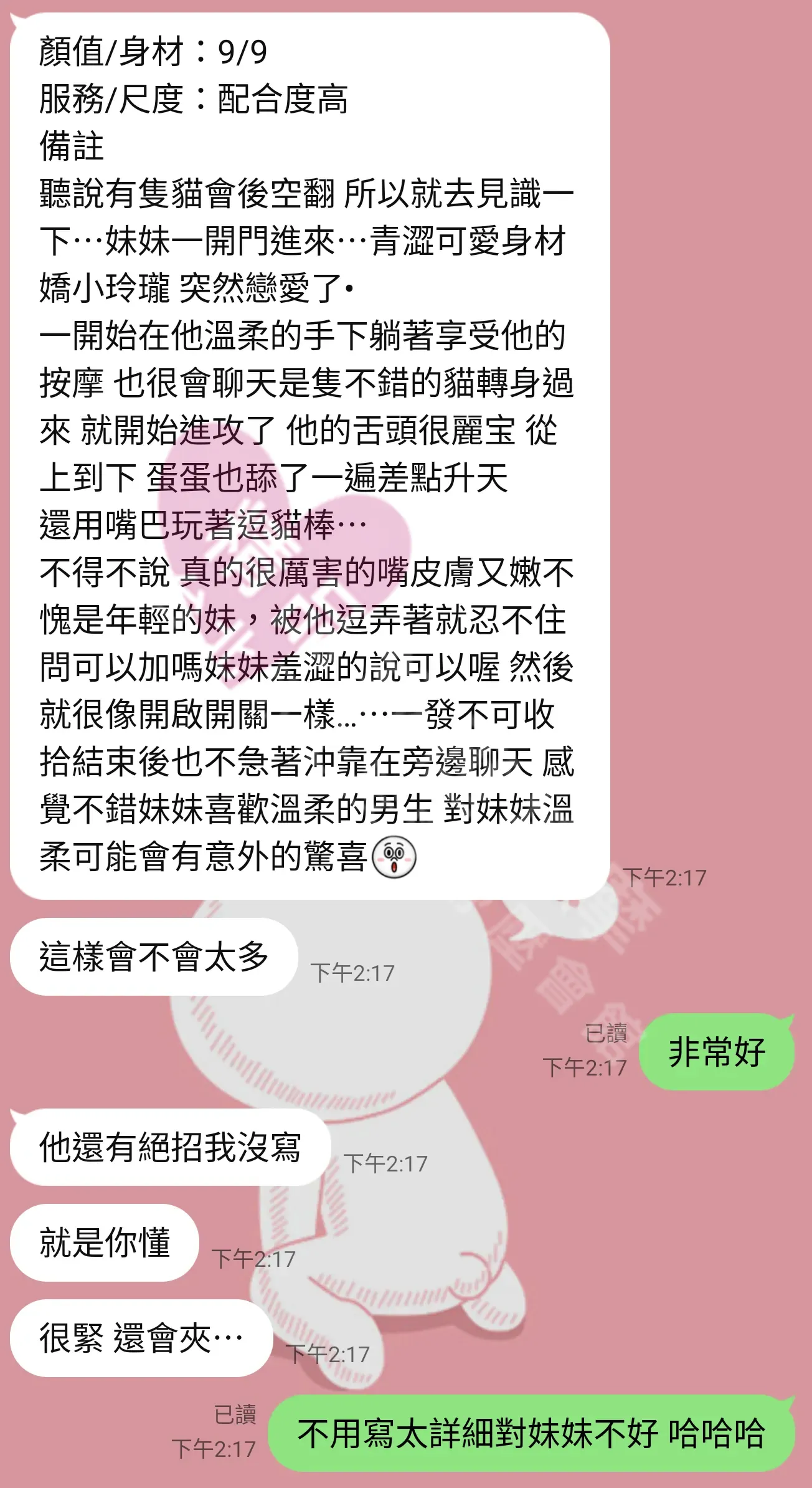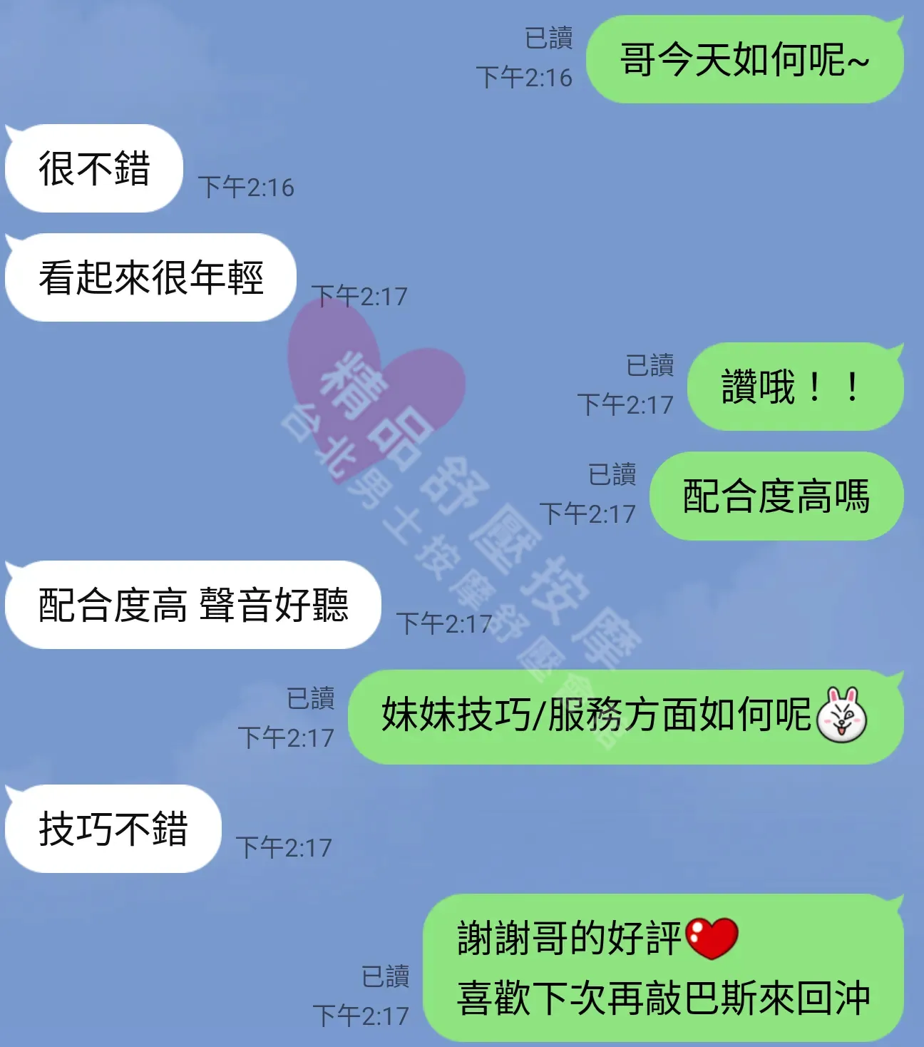 美容師都很有禮貌,先幫你背部按摩聊聊天,前戲會開始調情輕功,再來就是重點部位的加強。如果預算,也可以跟美容師聊聊加值服務,放心問都有機會。精品舒壓期待每位客人每次來舒壓都有個Happy Ending!