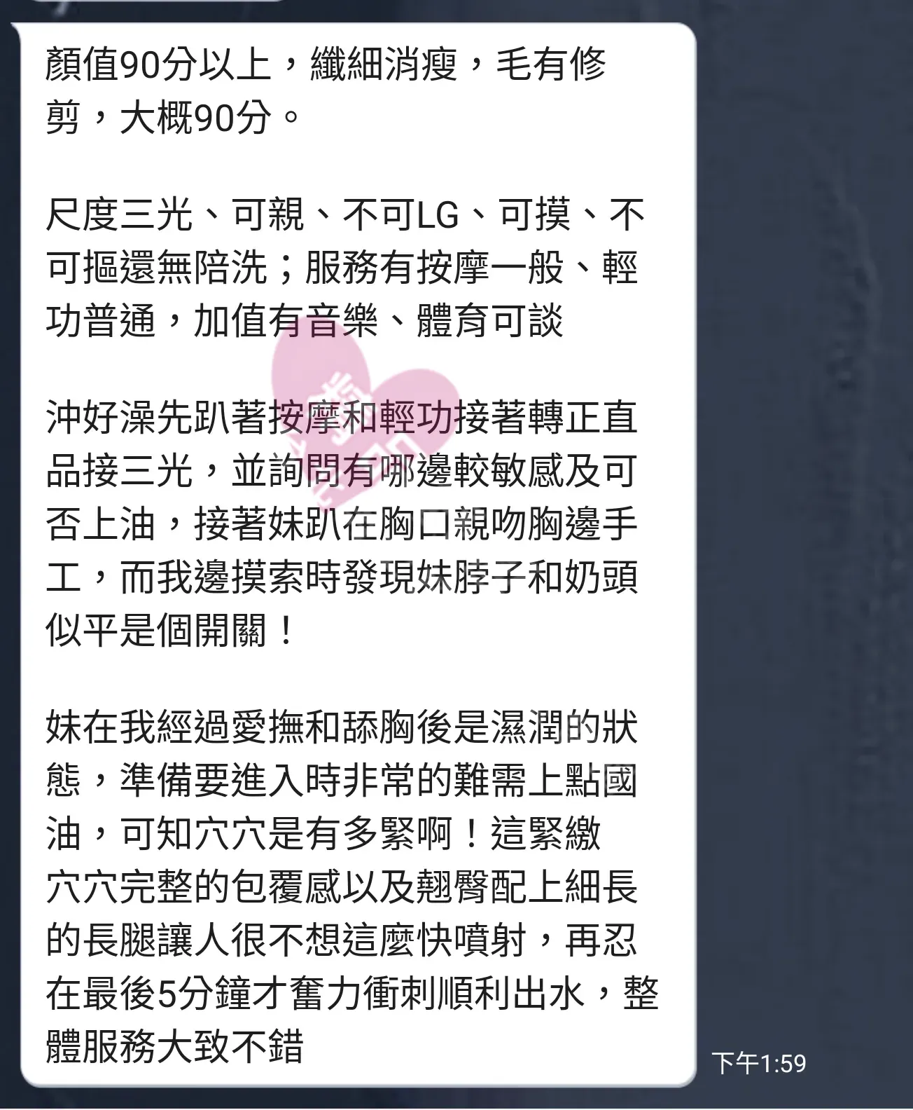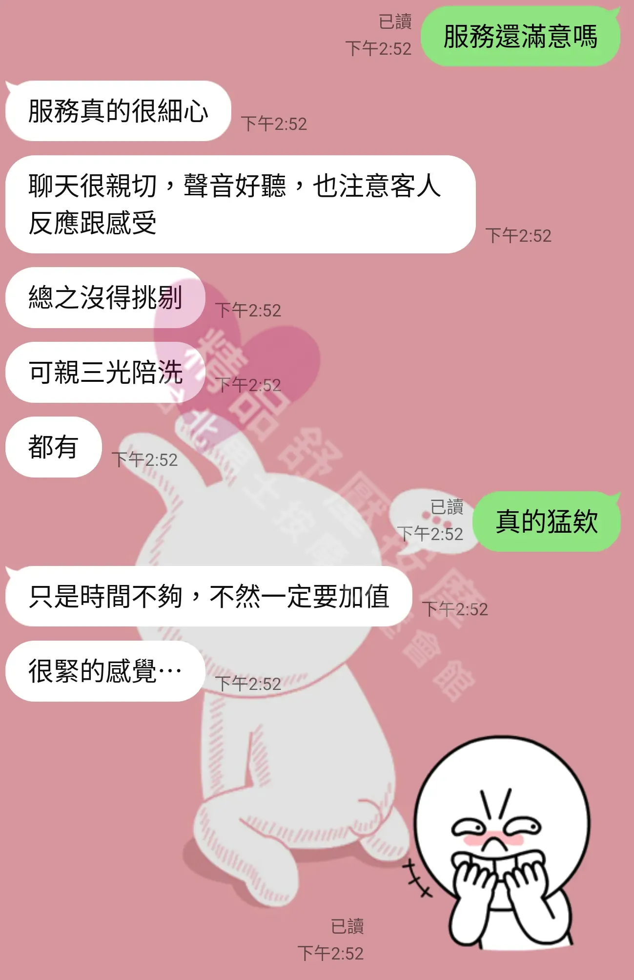 美容師都很有禮貌,先幫你背部按摩聊聊天,前戲會開始調情輕功,再來就是重點部位的加強。如果預算,也可以跟美容師聊聊加值服務,放心問都有機會。精品舒壓期待每位客人每次來舒壓都有個Happy Ending!
