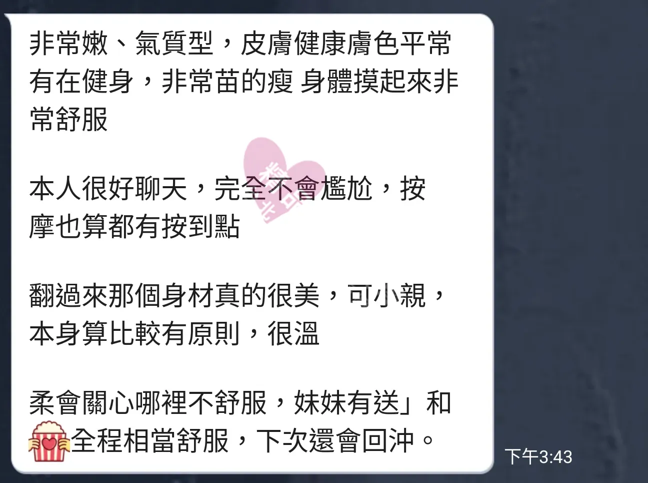 美容師都很有禮貌,先幫你背部按摩聊聊天,前戲會開始調情輕功,再來就是重點部位的加強。如果預算,也可以跟美容師聊聊加值服務,放心問都有機會。精品舒壓期待每位客人每次來舒壓都有個Happy Ending!