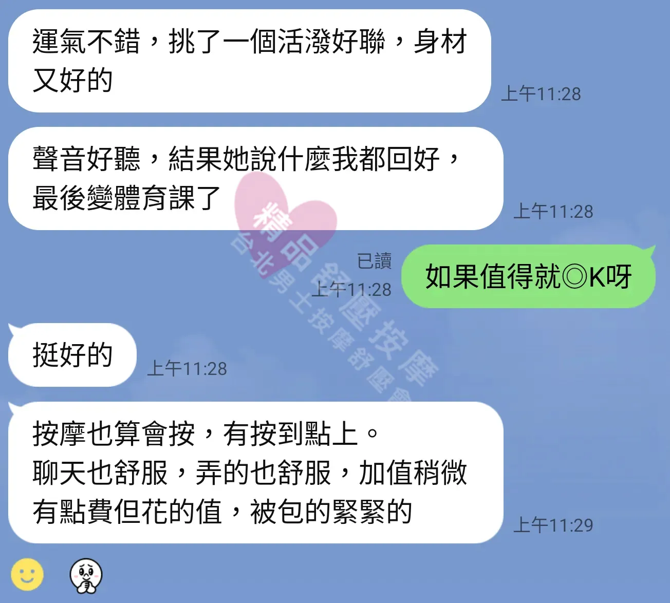 美容師都很有禮貌,先幫你背部按摩聊聊天,前戲會開始調情輕功,再來就是重點部位的加強。如果預算,也可以跟美容師聊聊加值服務,放心問都有機會。精品舒壓期待每位客人每次來舒壓都有個Happy Ending!