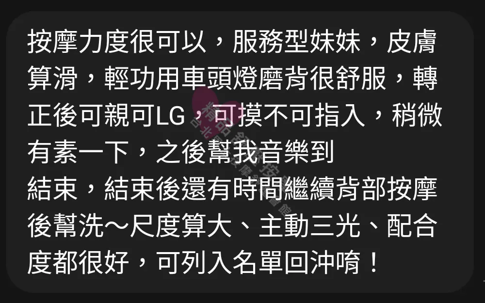 美容師都很有禮貌,先幫你背部按摩聊聊天,前戲會開始調情輕功,再來就是重點部位的加強。如果預算,也可以跟美容師聊聊加值服務,放心問都有機會。精品舒壓期待每位客人每次來舒壓都有個Happy Ending!