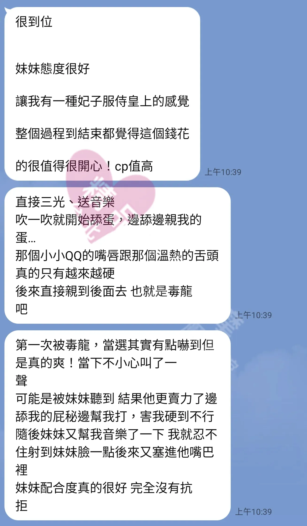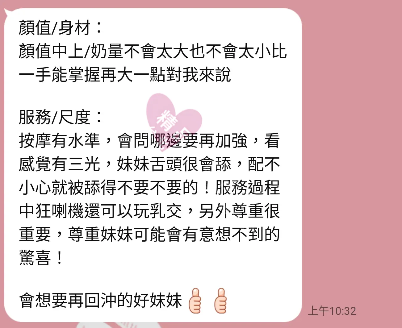 美容師都很有禮貌,先幫你背部按摩聊聊天,前戲會開始調情輕功,再來就是重點部位的加強。如果預算,也可以跟美容師聊聊加值服務,放心問都有機會。精品舒壓期待每位客人每次來舒壓都有個Happy Ending!