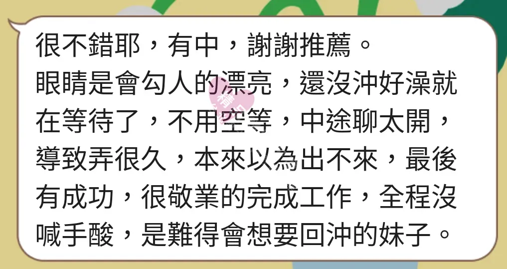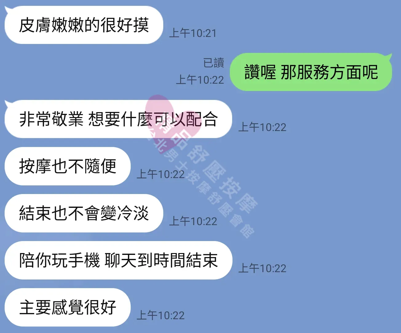 美容師都很有禮貌,先幫你背部按摩聊聊天,前戲會開始調情輕功,再來就是重點部位的加強。如果預算,也可以跟美容師聊聊加值服務,放心問都有機會。精品舒壓期待每位客人每次來舒壓都有個Happy Ending!