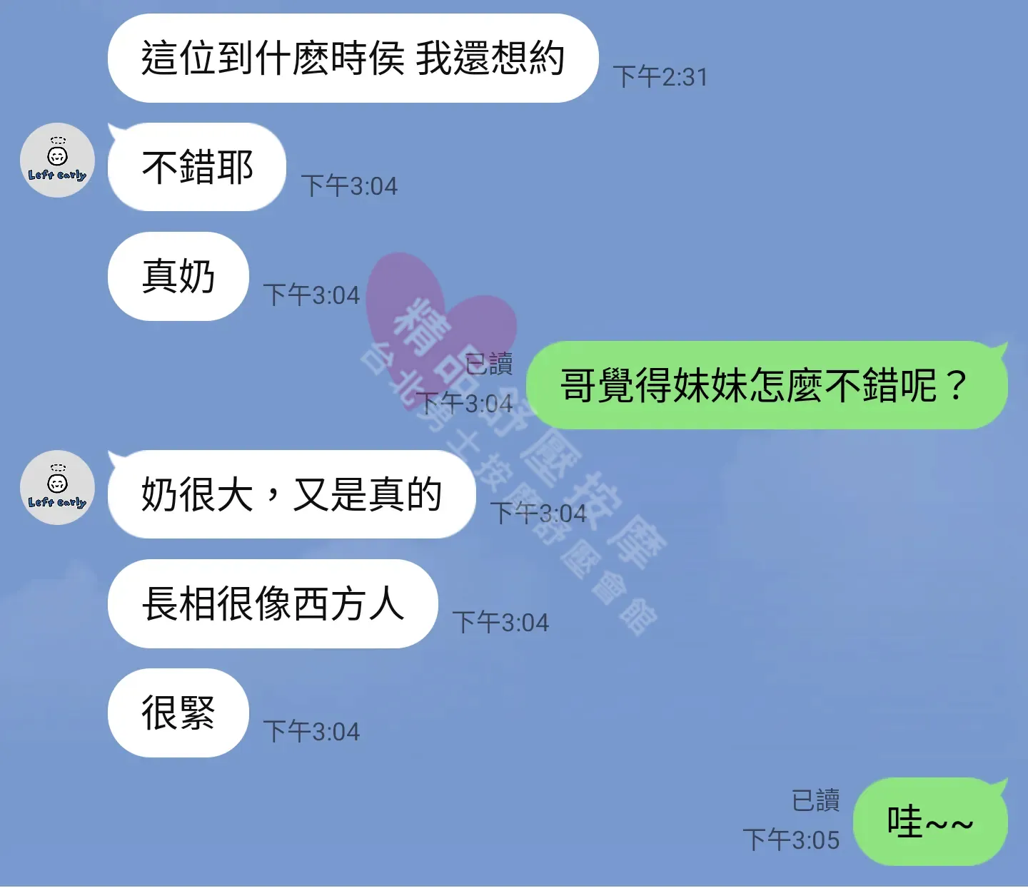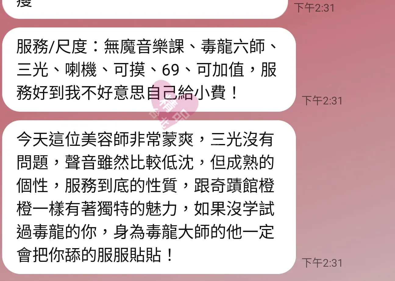 美容師都很有禮貌,先幫你背部按摩聊聊天,前戲會開始調情輕功,再來就是重點部位的加強。如果預算,也可以跟美容師聊聊加值服務,放心問都有機會。精品舒壓期待每位客人每次來舒壓都有個Happy Ending!