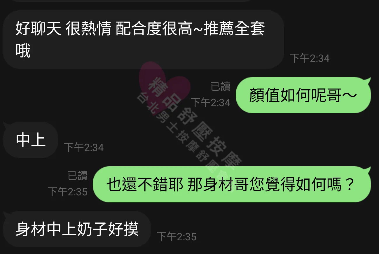 美容師都很有禮貌,先幫你背部按摩聊聊天,前戲會開始調情輕功,再來就是重點部位的加強。如果預算,也可以跟美容師聊聊加值服務,放心問都有機會。精品舒壓期待每位客人每次來舒壓都有個Happy Ending!