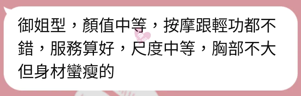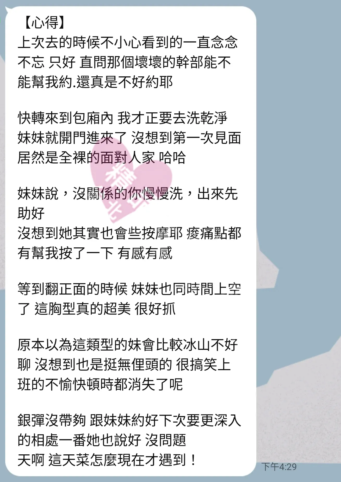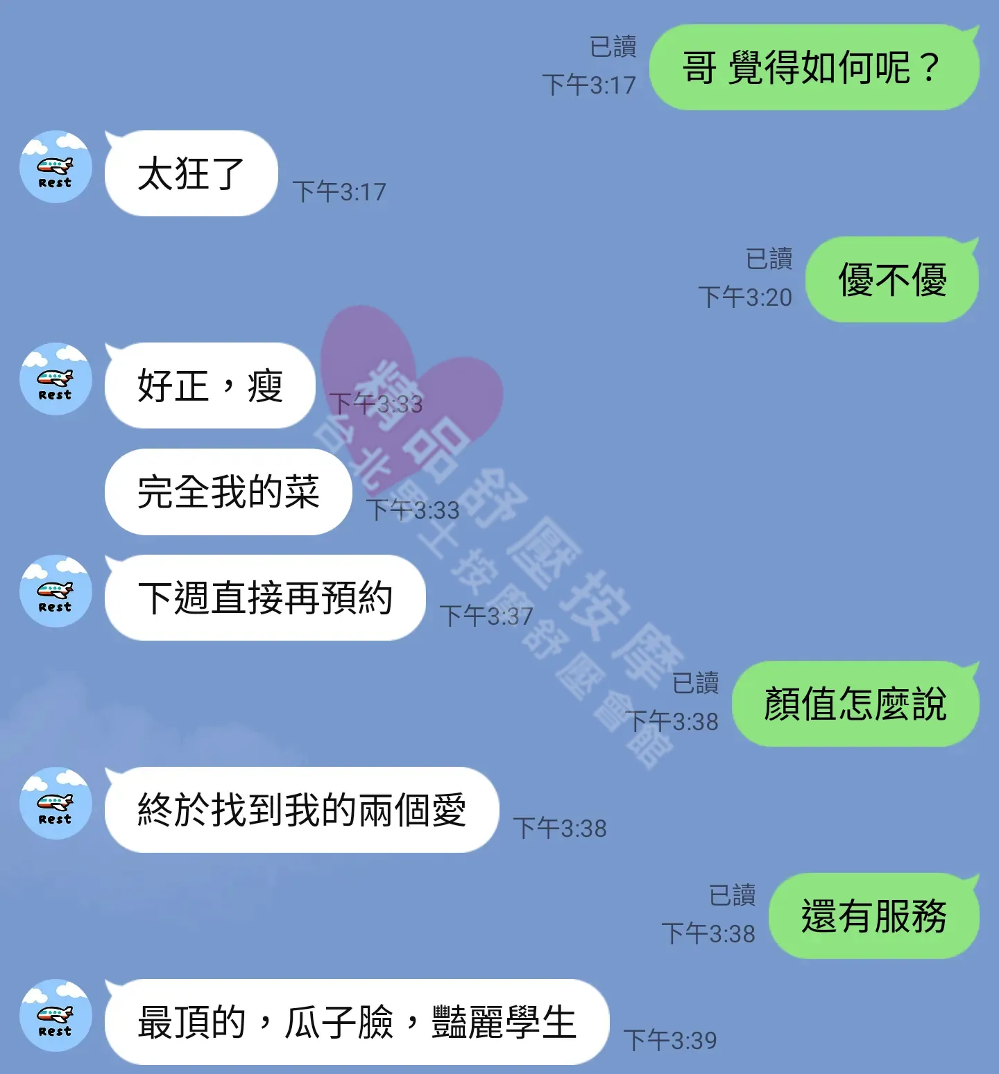 美容師都很有禮貌,先幫你背部按摩聊聊天,前戲會開始調情輕功,再來就是重點部位的加強。如果預算,也可以跟美容師聊聊加值服務,放心問都有機會。精品舒壓期待每位客人每次來舒壓都有個Happy Ending!
