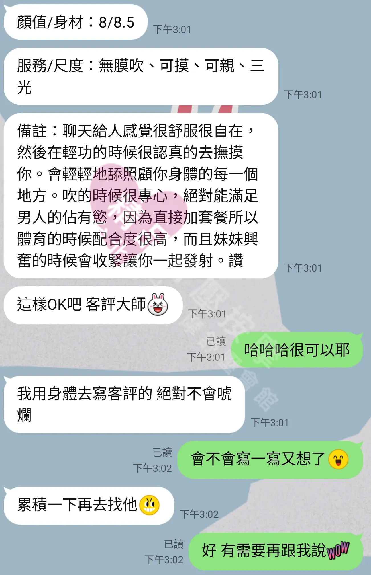 美容師都很有禮貌,先幫你背部按摩聊聊天,前戲會開始調情輕功,再來就是重點部位的加強。如果預算,也可以跟美容師聊聊加值服務,放心問都有機會。精品舒壓期待每位客人每次來舒壓都有個Happy Ending!