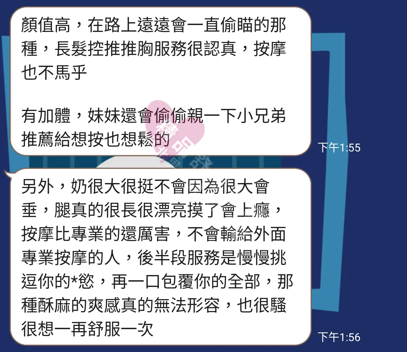 美容師都很有禮貌,先幫你背部按摩聊聊天,前戲會開始調情輕功,再來就是重點部位的加強。如果預算,也可以跟美容師聊聊加值服務,放心問都有機會。精品舒壓期待每位客人每次來舒壓都有個Happy Ending!