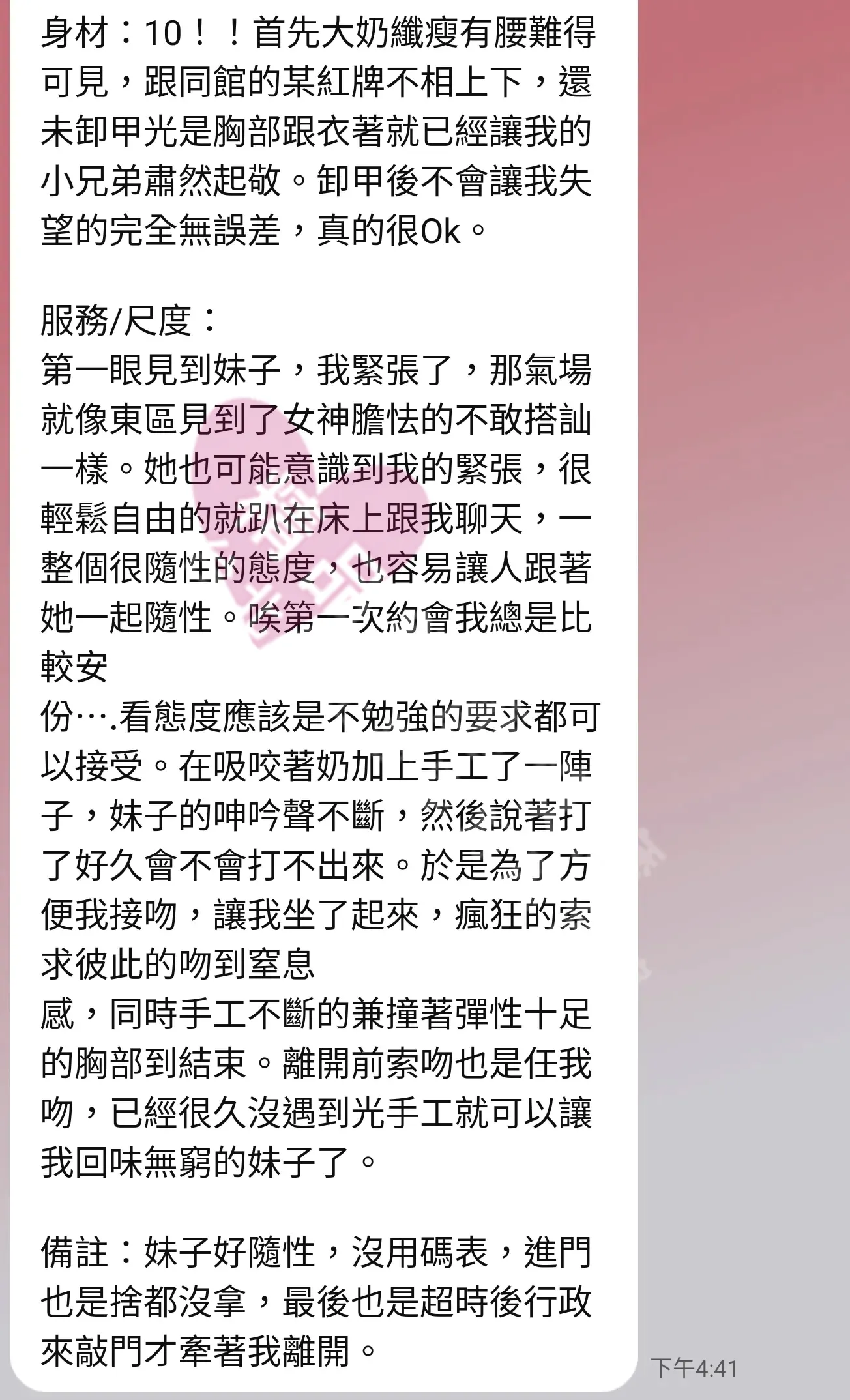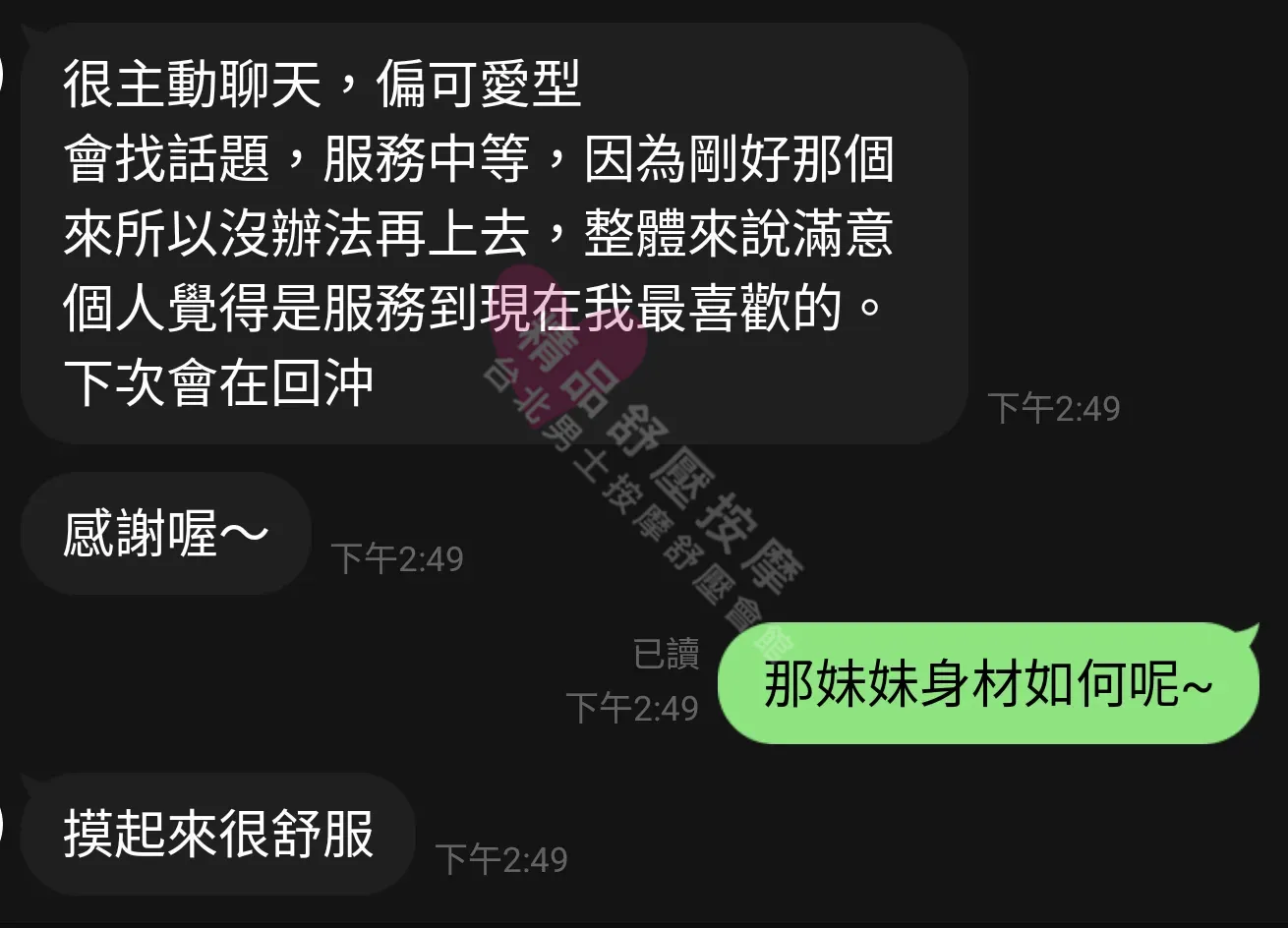 美容師都很有禮貌,先幫你背部按摩聊聊天,前戲會開始調情輕功,再來就是重點部位的加強。如果預算,也可以跟美容師聊聊加值服務,放心問都有機會。精品舒壓期待每位客人每次來舒壓都有個Happy Ending!