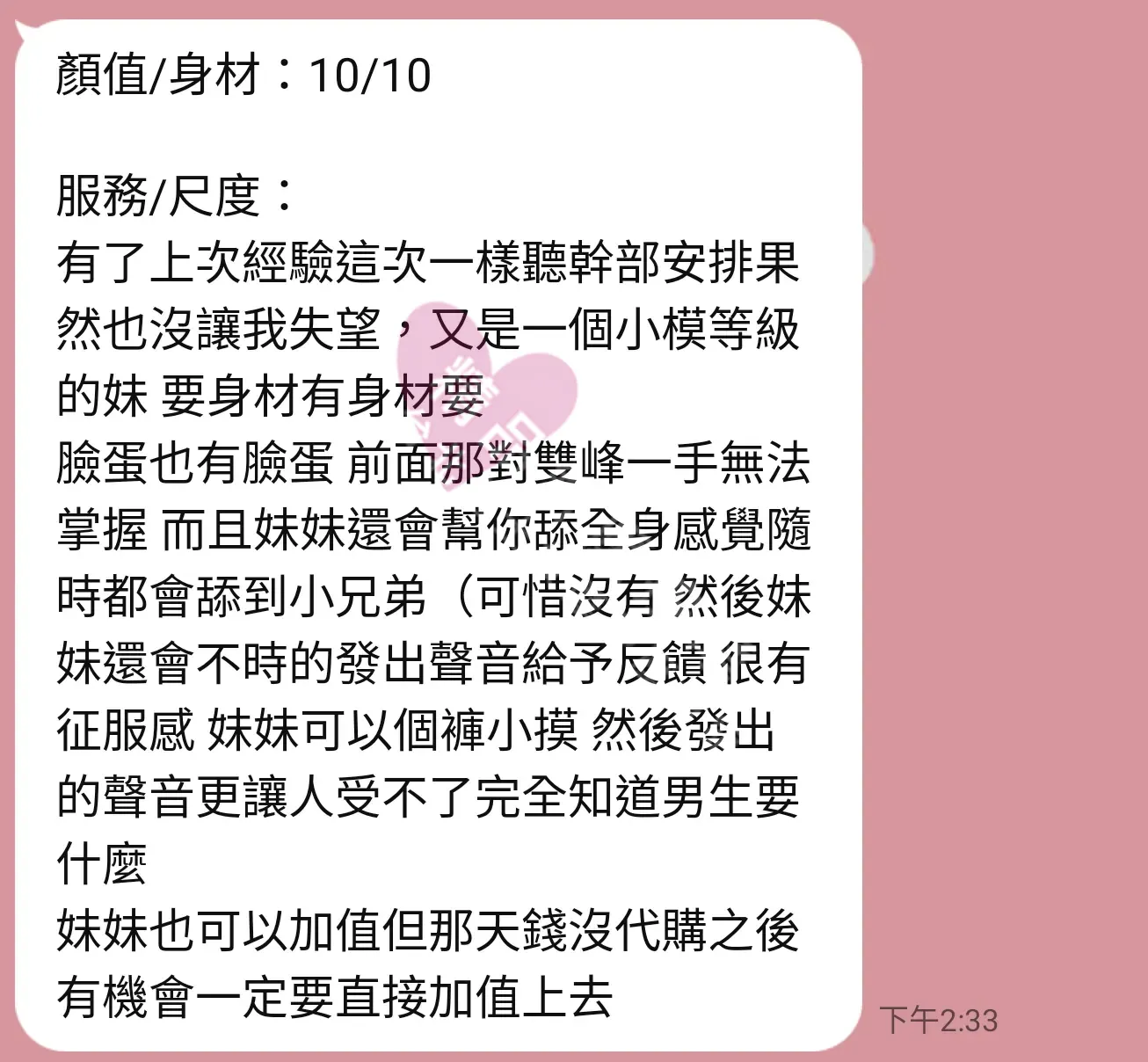 美容師都很有禮貌,先幫你背部按摩聊聊天,前戲會開始調情輕功,再來就是重點部位的加強。如果預算,也可以跟美容師聊聊加值服務,放心問都有機會。精品舒壓期待每位客人每次來舒壓都有個Happy Ending!