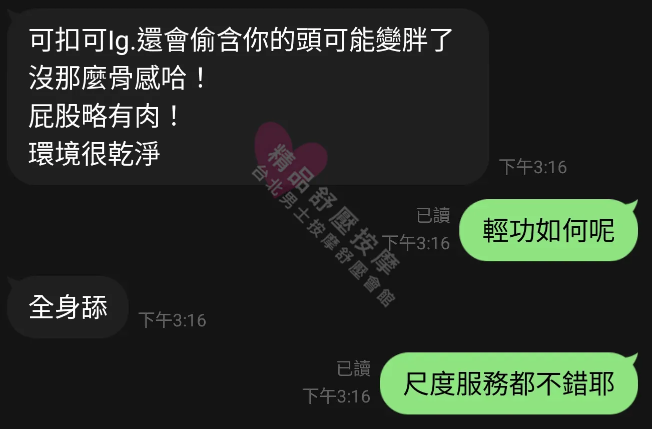 美容師都很有禮貌,先幫你背部按摩聊聊天,前戲會開始調情輕功,再來就是重點部位的加強。如果預算,也可以跟美容師聊聊加值服務,放心問都有機會。精品舒壓期待每位客人每次來舒壓都有個Happy Ending!