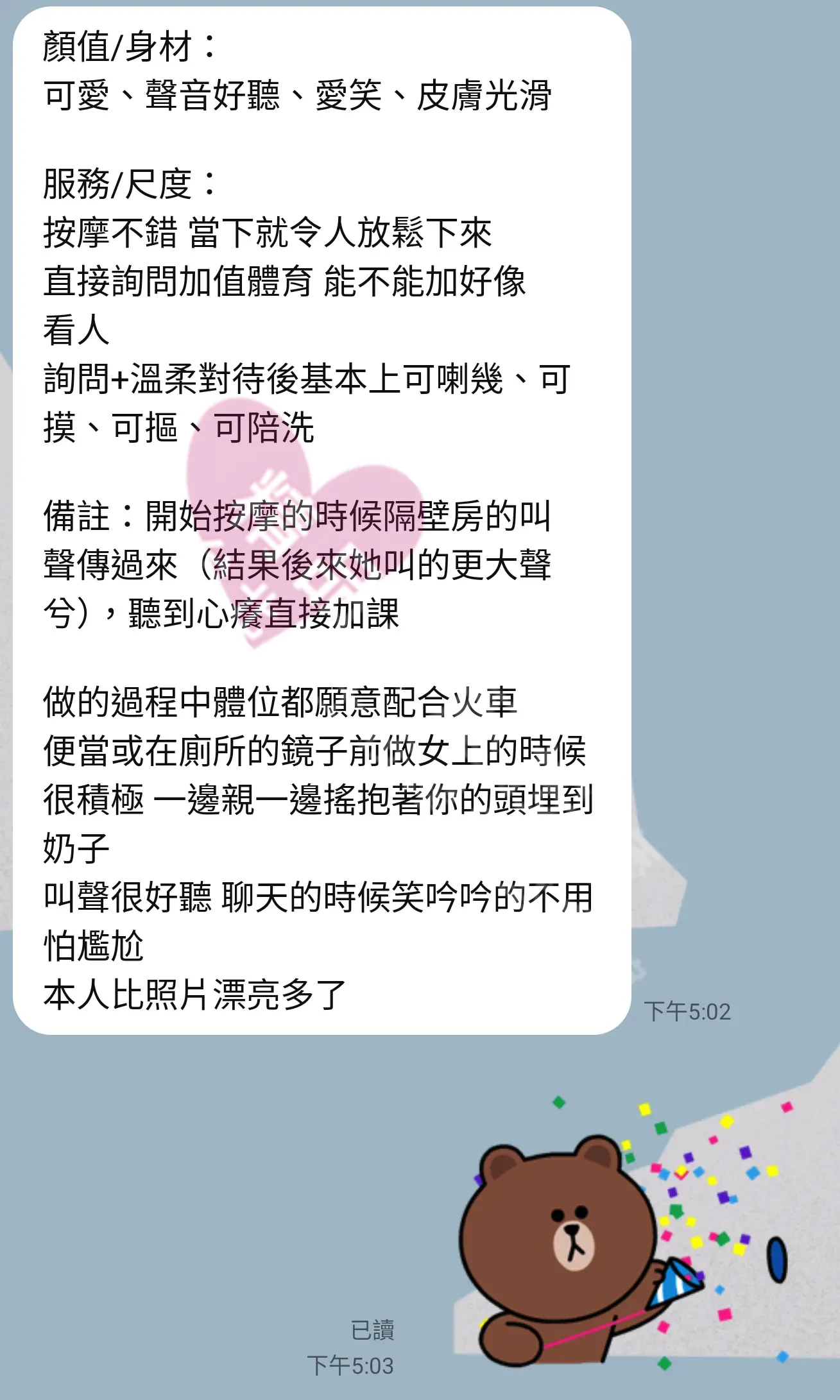 美容師都很有禮貌,先幫你背部按摩聊聊天,前戲會開始調情輕功,再來就是重點部位的加強。如果預算,也可以跟美容師聊聊加值服務,放心問都有機會。精品舒壓期待每位客人每次來舒壓都有個Happy Ending!