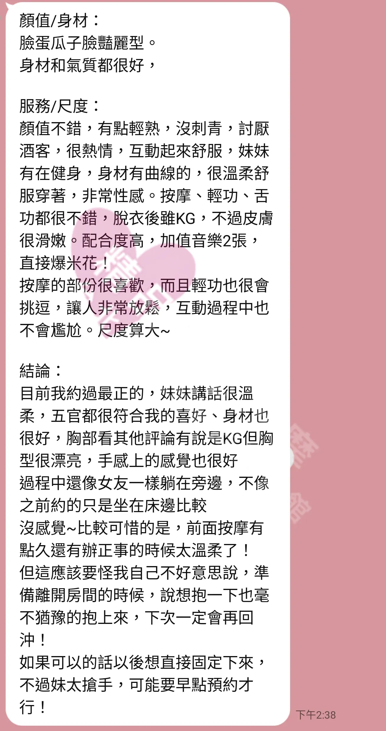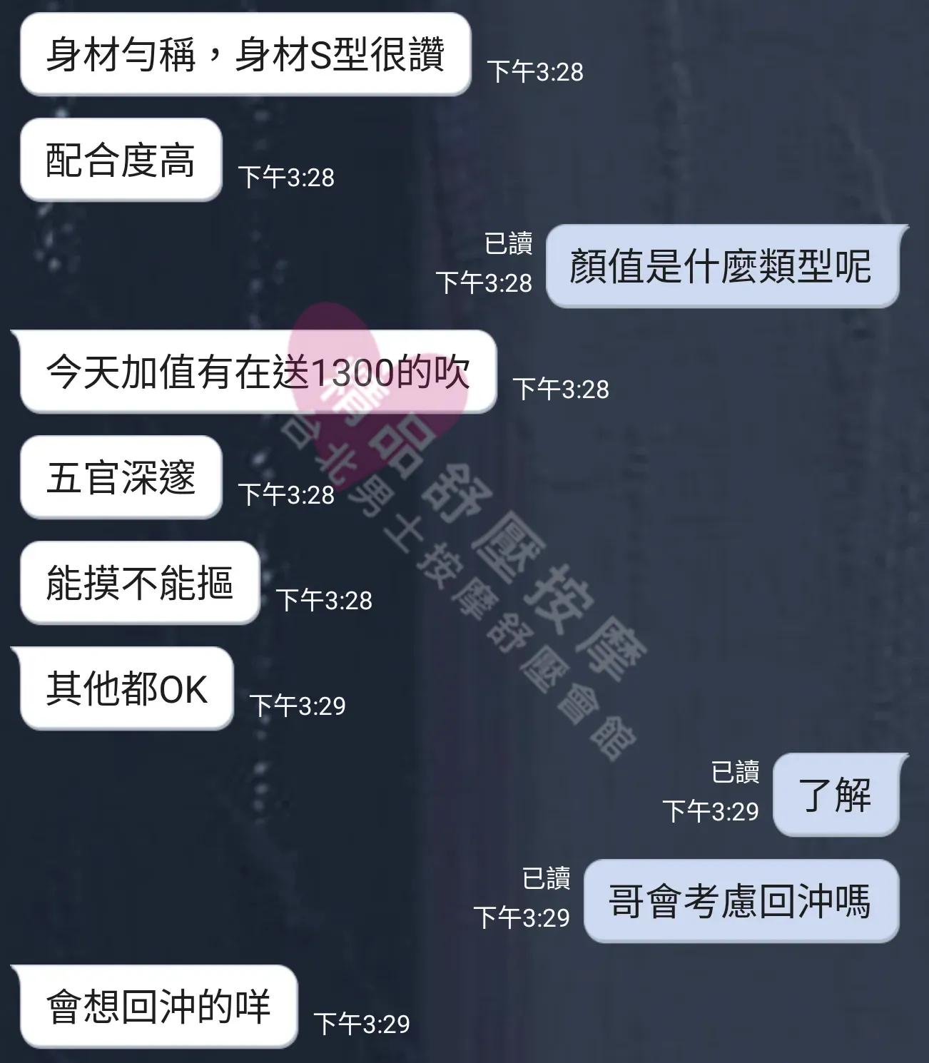 美容師都很有禮貌,先幫你背部按摩聊聊天,前戲會開始調情輕功,再來就是重點部位的加強。如果預算,也可以跟美容師聊聊加值服務,放心問都有機會。精品舒壓期待每位客人每次來舒壓都有個Happy Ending!