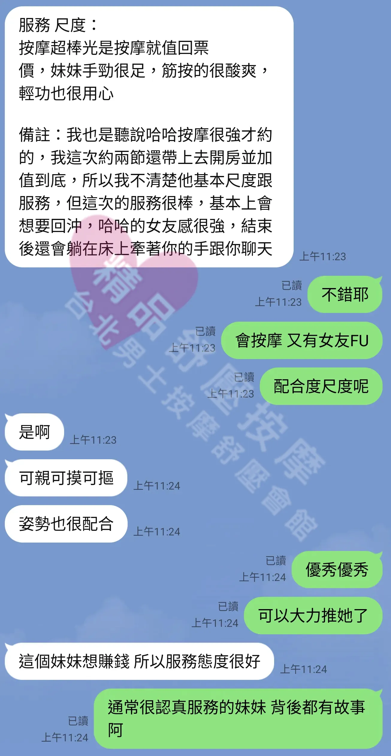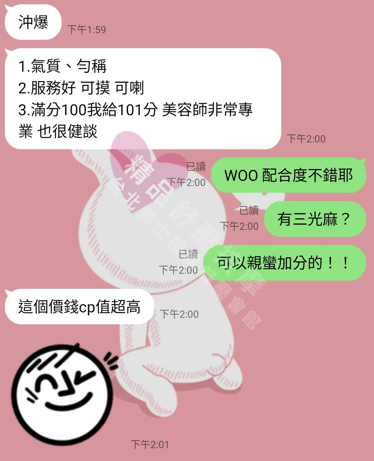 美容師都很有禮貌,先幫你背部按摩聊聊天,前戲會開始調情輕功,再來就是重點部位的加強。如果預算,也可以跟美容師聊聊加值服務,放心問都有機會。精品舒壓期待每位客人每次來舒壓都有個Happy Ending!