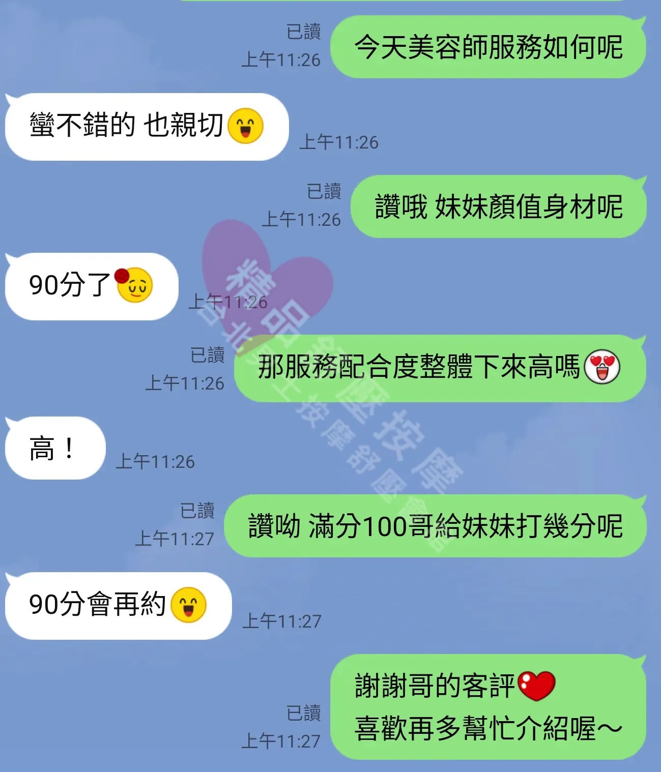 美容師都很有禮貌,先幫你背部按摩聊聊天,前戲會開始調情輕功,再來就是重點部位的加強。如果預算,也可以跟美容師聊聊加值服務,放心問都有機會。精品舒壓期待每位客人每次來舒壓都有個Happy Ending!