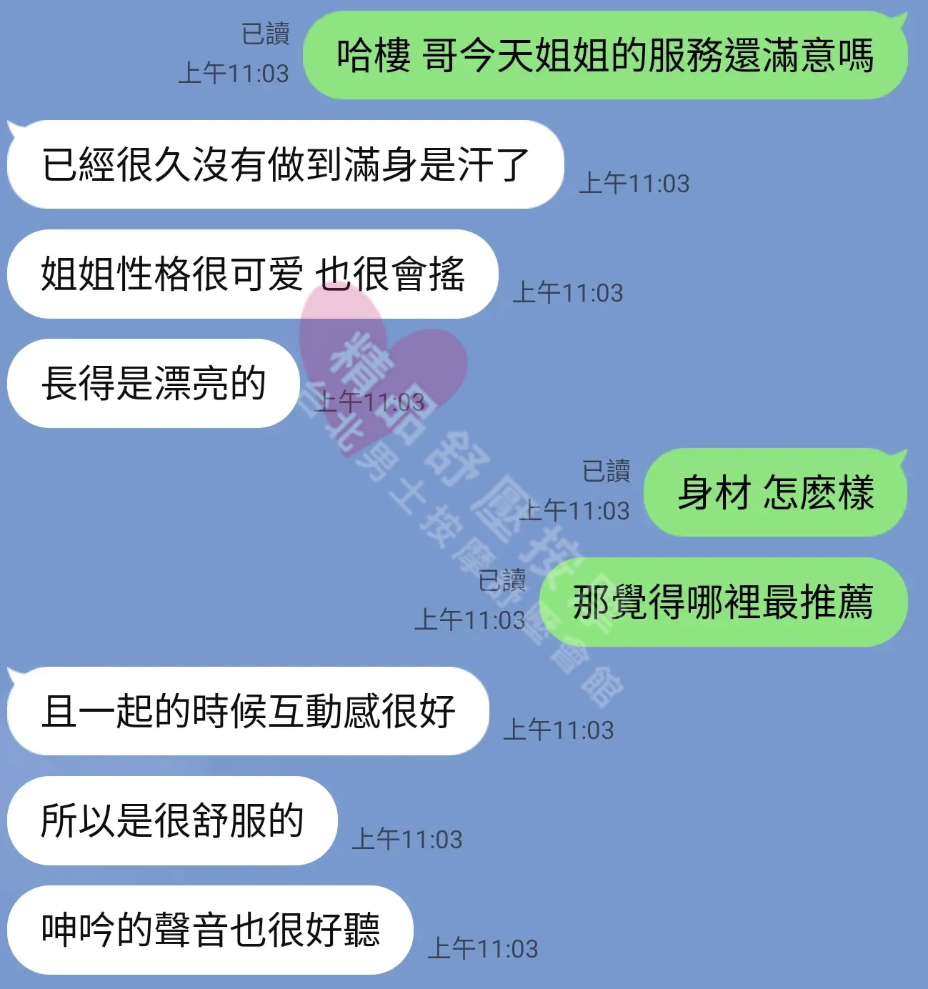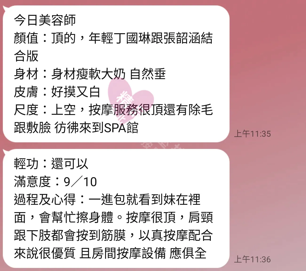 美容師都很有禮貌,先幫你背部按摩聊聊天,前戲會開始調情輕功,再來就是重點部位的加強。如果預算,也可以跟美容師聊聊加值服務,放心問都有機會。精品舒壓期待每位客人每次來舒壓都有個Happy Ending!