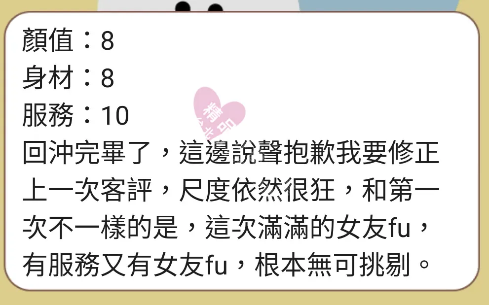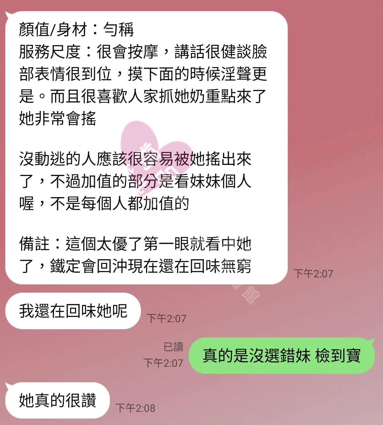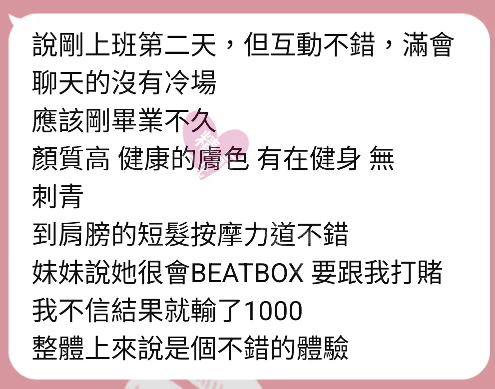 美容師都很有禮貌,先幫你背部按摩聊聊天,前戲會開始調情輕功,再來就是重點部位的加強。如果預算,也可以跟美容師聊聊加值服務,放心問都有機會。精品舒壓期待每位客人每次來舒壓都有個Happy Ending!