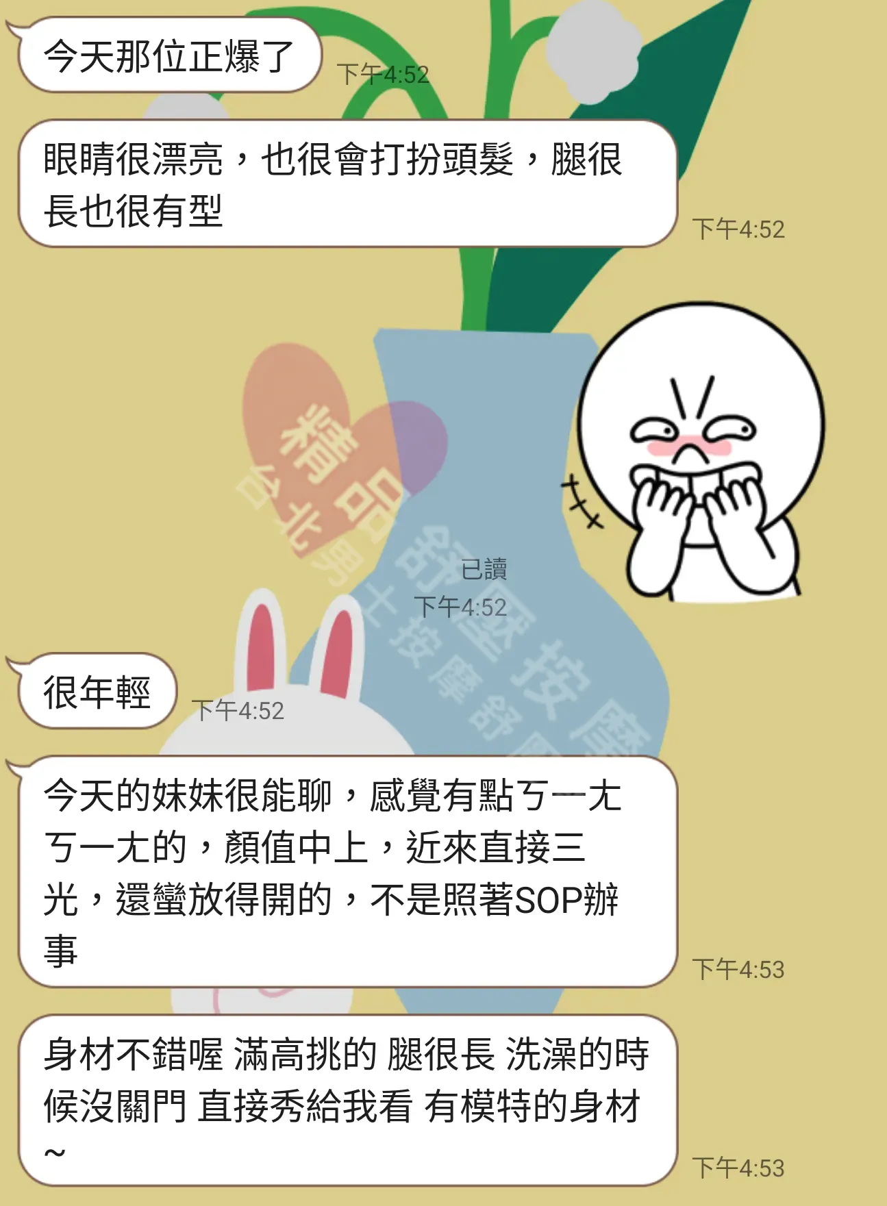 美容師都很有禮貌,先幫你背部按摩聊聊天,前戲會開始調情輕功,再來就是重點部位的加強。如果預算,也可以跟美容師聊聊加值服務,放心問都有機會。精品舒壓期待每位客人每次來舒壓都有個Happy Ending!