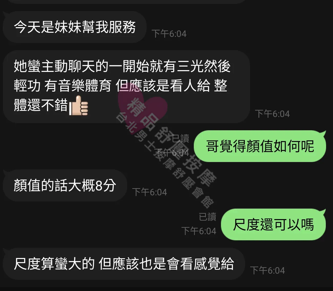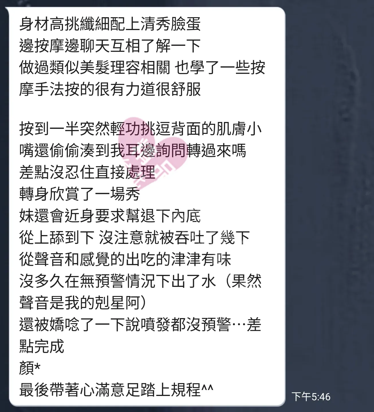 美容師都很有禮貌,先幫你背部按摩聊聊天,前戲會開始調情輕功,再來就是重點部位的加強。如果預算,也可以跟美容師聊聊加值服務,放心問都有機會。精品舒壓期待每位客人每次來舒壓都有個Happy Ending!