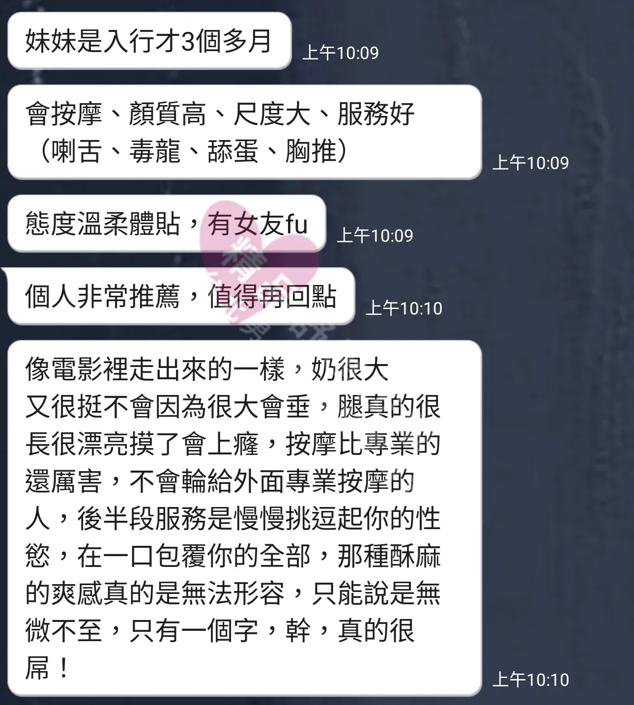 美容師都很有禮貌,先幫你背部按摩聊聊天,前戲會開始調情輕功,再來就是重點部位的加強。如果預算,也可以跟美容師聊聊加值服務,放心問都有機會。精品舒壓期待每位客人每次來舒壓都有個Happy Ending!