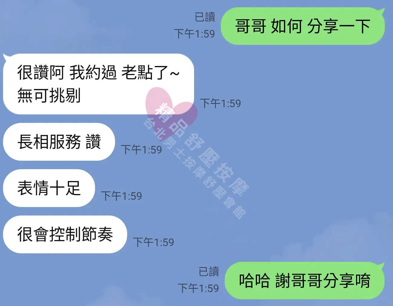 美容師都很有禮貌,先幫你背部按摩聊聊天,前戲會開始調情輕功,再來就是重點部位的加強。如果預算,也可以跟美容師聊聊加值服務,放心問都有機會。精品舒壓期待每位客人每次來舒壓都有個Happy Ending!