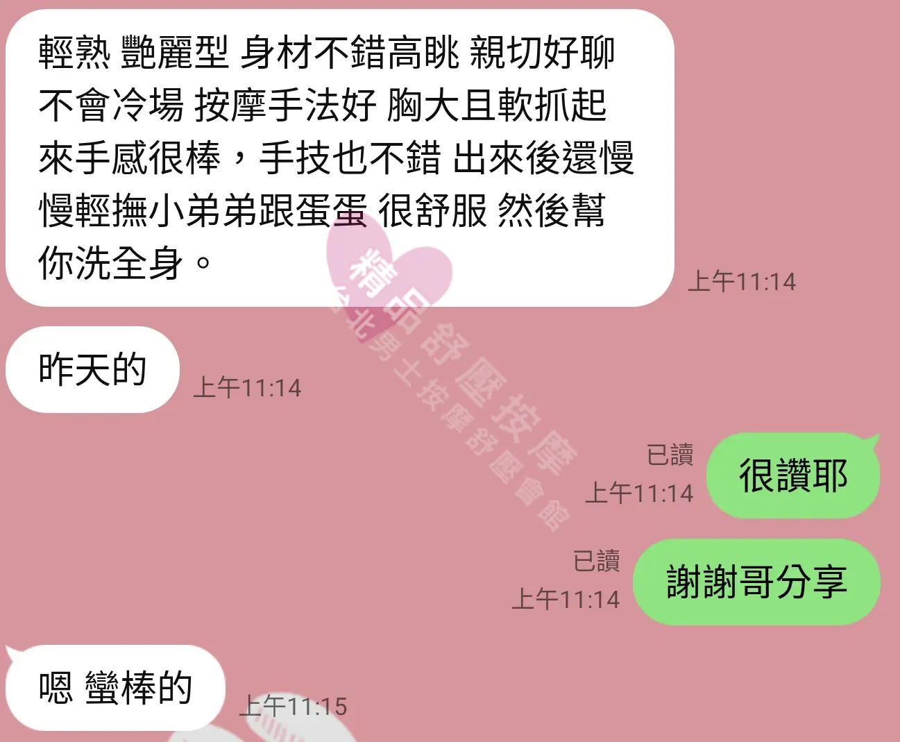 美容師都很有禮貌,先幫你背部按摩聊聊天,前戲會開始調情輕功,再來就是重點部位的加強。如果預算,也可以跟美容師聊聊加值服務,放心問都有機會。精品舒壓期待每位客人每次來舒壓都有個Happy Ending!