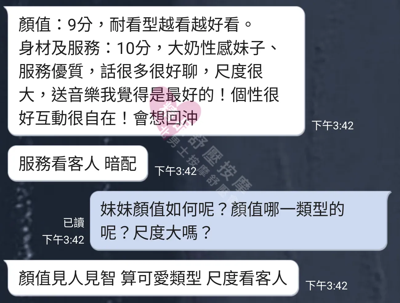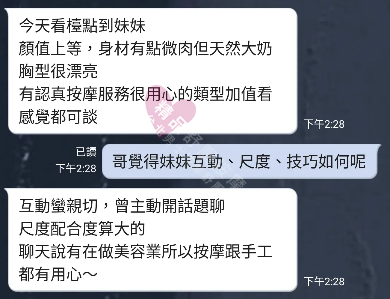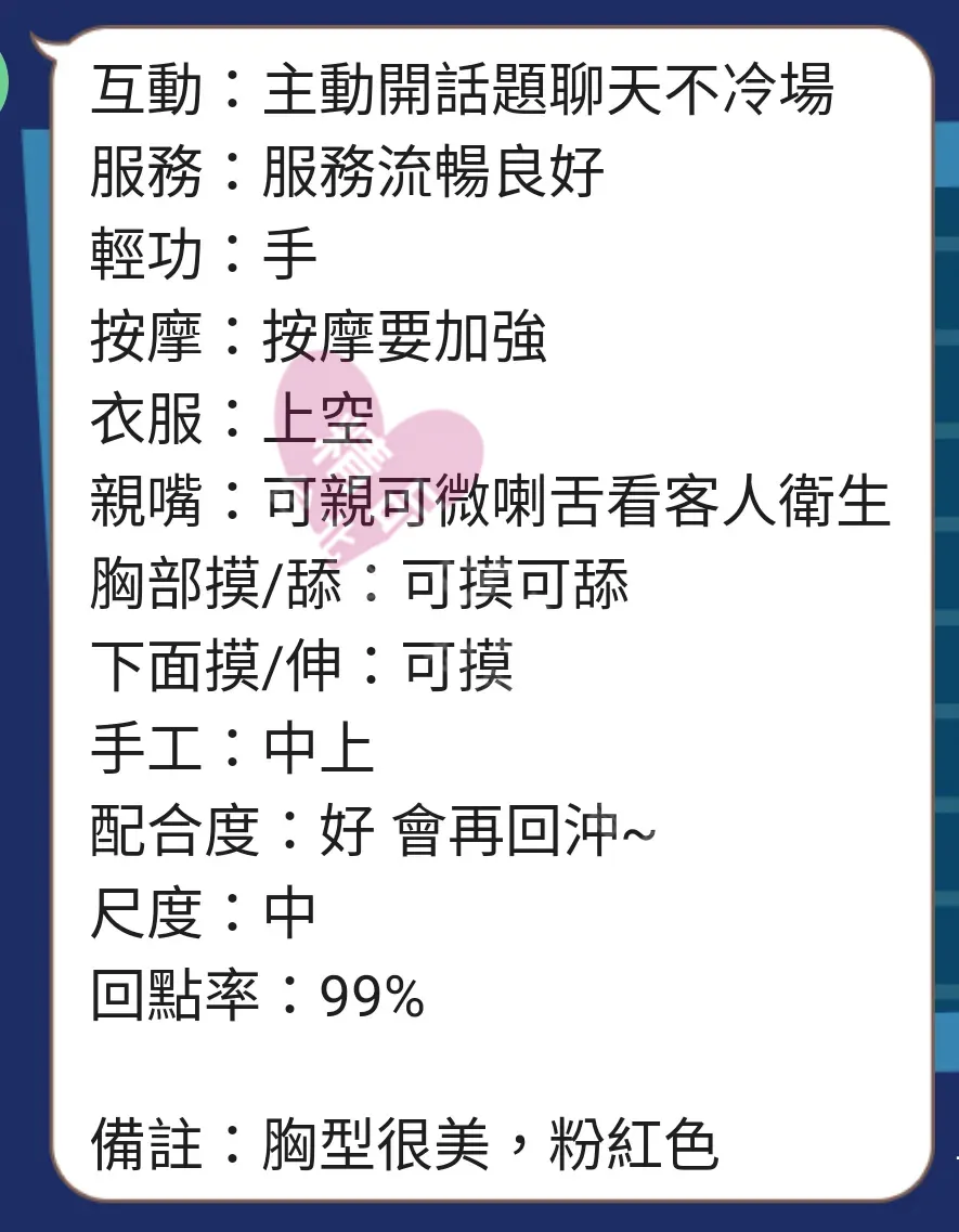 美容師都很有禮貌,先幫你背部按摩聊聊天,前戲會開始調情輕功,再來就是重點部位的加強。如果預算,也可以跟美容師聊聊加值服務,放心問都有機會。精品舒壓期待每位客人每次來舒壓都有個Happy Ending!