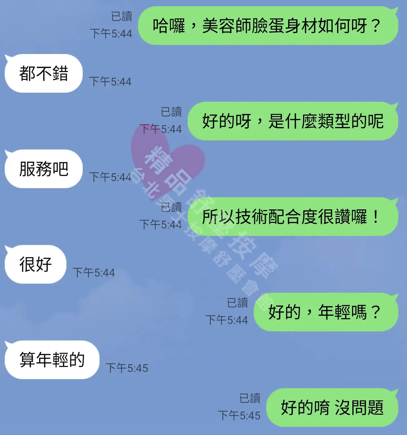 美容師都很有禮貌,先幫你背部按摩聊聊天,前戲會開始調情輕功,再來就是重點部位的加強。如果預算,也可以跟美容師聊聊加值服務,放心問都有機會。精品舒壓期待每位客人每次來舒壓都有個Happy Ending!