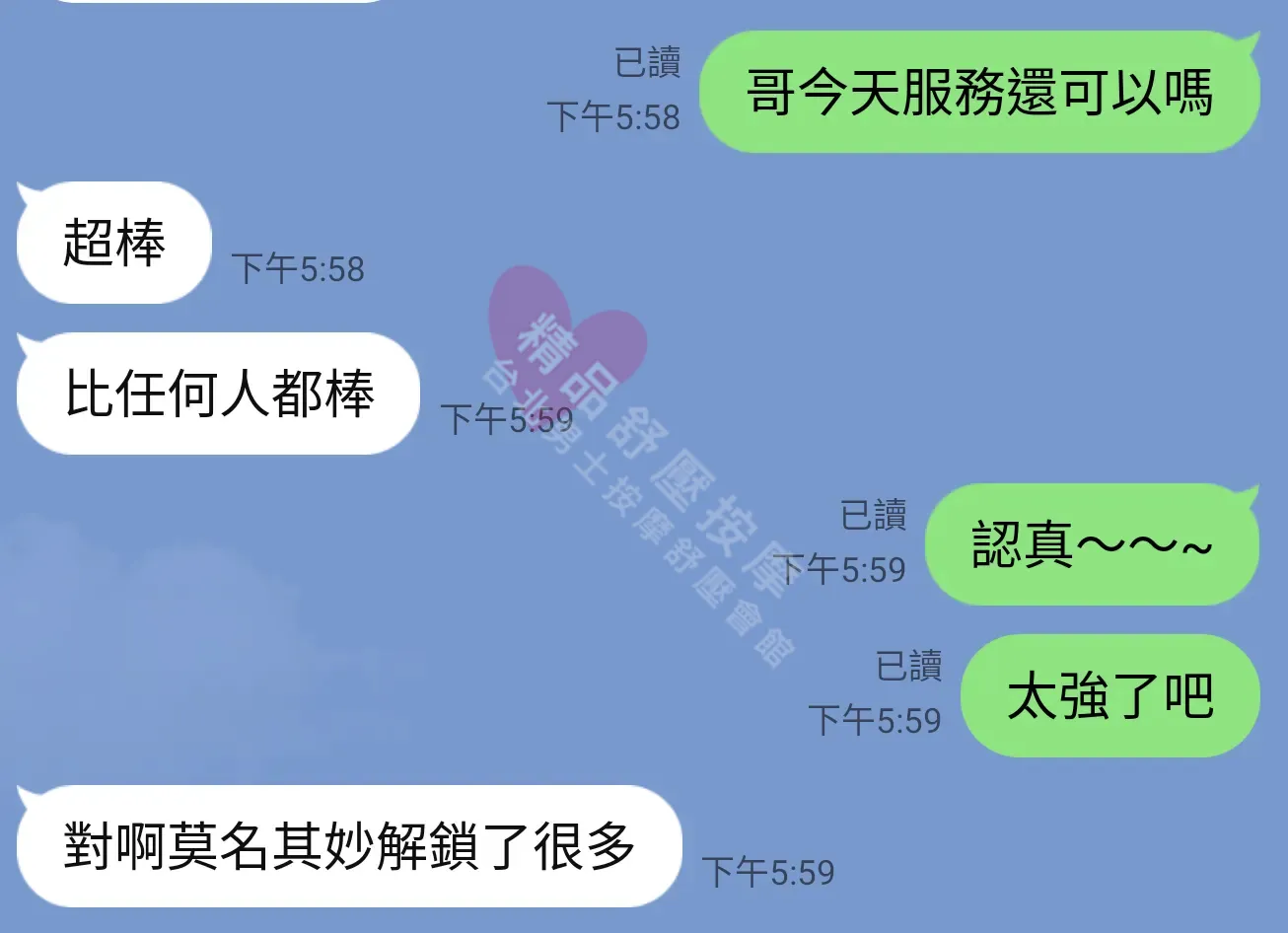 美容師都很有禮貌,先幫你背部按摩聊聊天,前戲會開始調情輕功,再來就是重點部位的加強。如果預算,也可以跟美容師聊聊加值服務,放心問都有機會。精品舒壓期待每位客人每次來舒壓都有個Happy Ending!