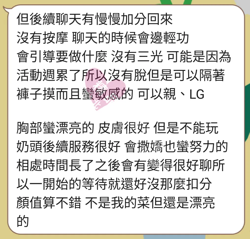 美容師都很有禮貌,先幫你背部按摩聊聊天,前戲會開始調情輕功,再來就是重點部位的加強。如果預算,也可以跟美容師聊聊加值服務,放心問都有機會。精品舒壓期待每位客人每次來舒壓都有個Happy Ending!