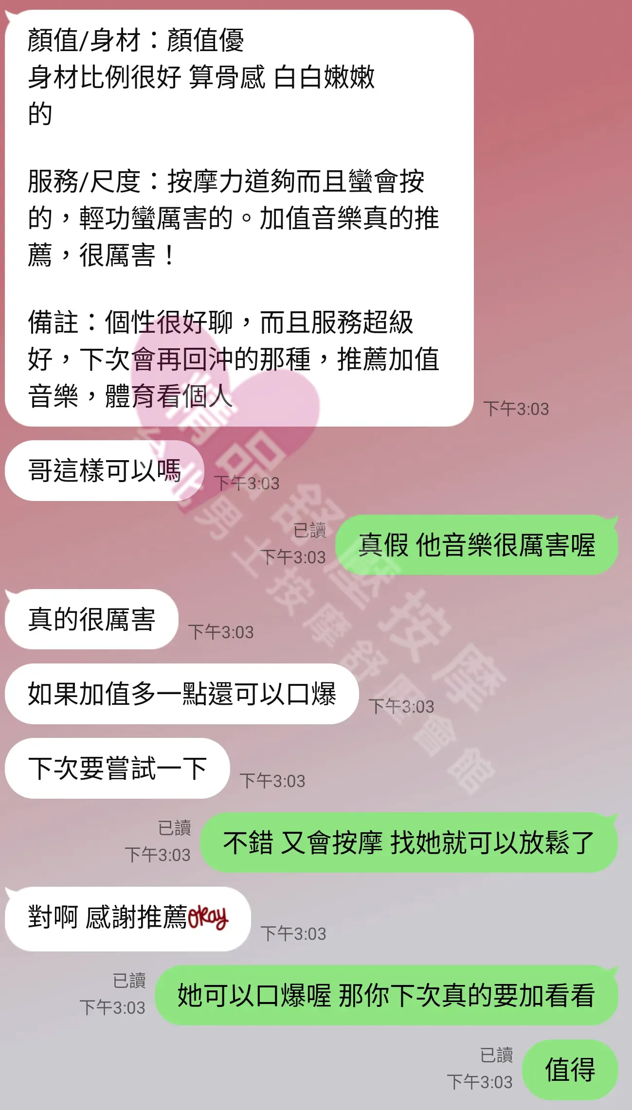 美容師都很有禮貌,先幫你背部按摩聊聊天,前戲會開始調情輕功,再來就是重點部位的加強。如果預算,也可以跟美容師聊聊加值服務,放心問都有機會。精品舒壓期待每位客人每次來舒壓都有個Happy Ending!