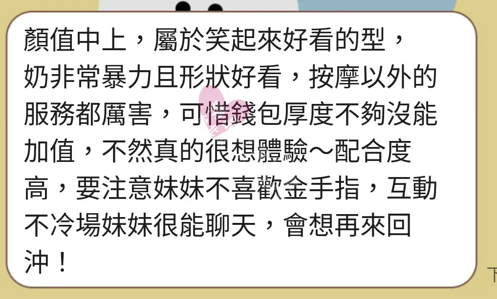 美容師都很有禮貌,先幫你背部按摩聊聊天,前戲會開始調情輕功,再來就是重點部位的加強。如果預算,也可以跟美容師聊聊加值服務,放心問都有機會。精品舒壓期待每位客人每次來舒壓都有個Happy Ending!