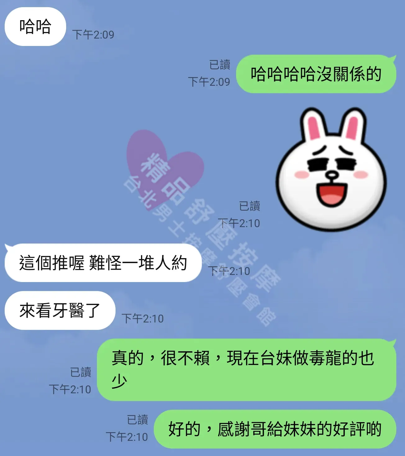 美容師都很有禮貌,先幫你背部按摩聊聊天,前戲會開始調情輕功,再來就是重點部位的加強。如果預算,也可以跟美容師聊聊加值服務,放心問都有機會。精品舒壓期待每位客人每次來舒壓都有個Happy Ending!