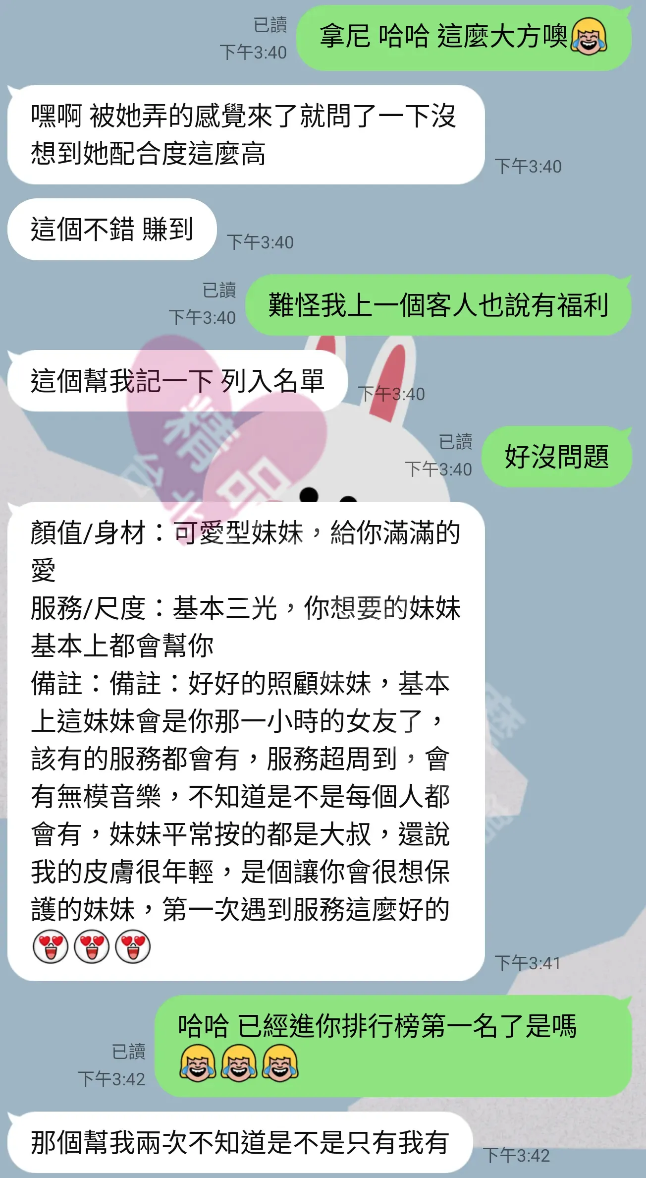 美容師都很有禮貌,先幫你背部按摩聊聊天,前戲會開始調情輕功,再來就是重點部位的加強。如果預算,也可以跟美容師聊聊加值服務,放心問都有機會。精品舒壓期待每位客人每次來舒壓都有個Happy Ending!