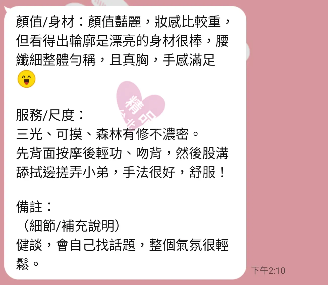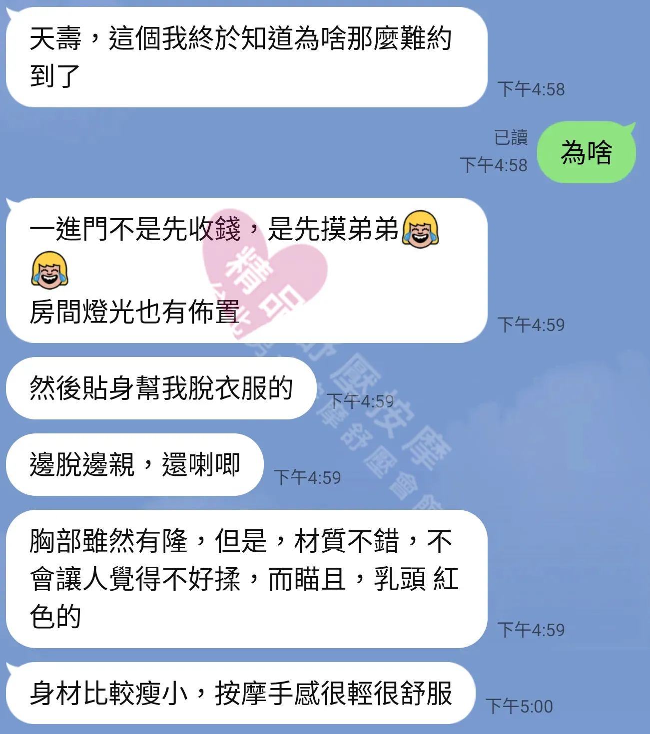 美容師都很有禮貌,先幫你背部按摩聊聊天,前戲會開始調情輕功,再來就是重點部位的加強。如果預算,也可以跟美容師聊聊加值服務,放心問都有機會。精品舒壓期待每位客人每次來舒壓都有個Happy Ending!