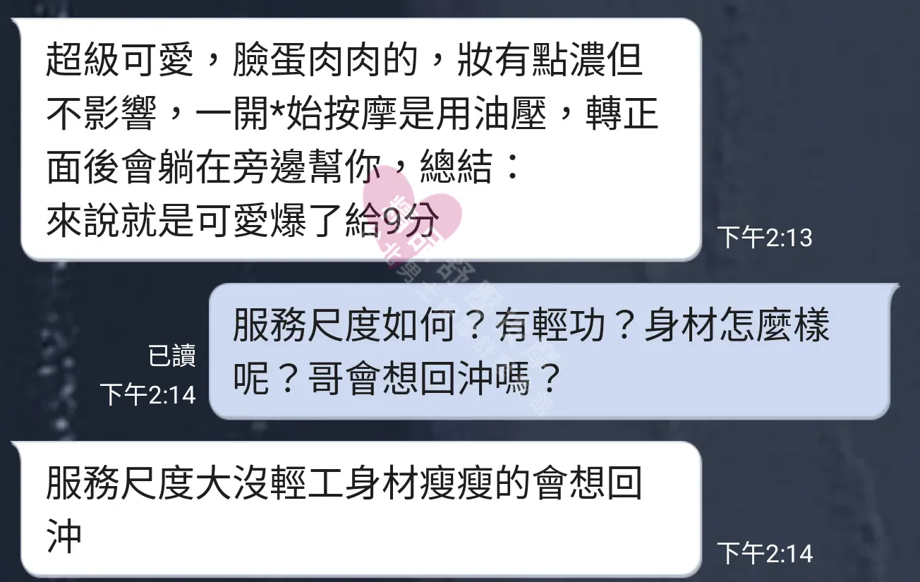 美容師都很有禮貌,先幫你背部按摩聊聊天,前戲會開始調情輕功,再來就是重點部位的加強。如果預算,也可以跟美容師聊聊加值服務,放心問都有機會。精品舒壓期待每位客人每次來舒壓都有個Happy Ending!
