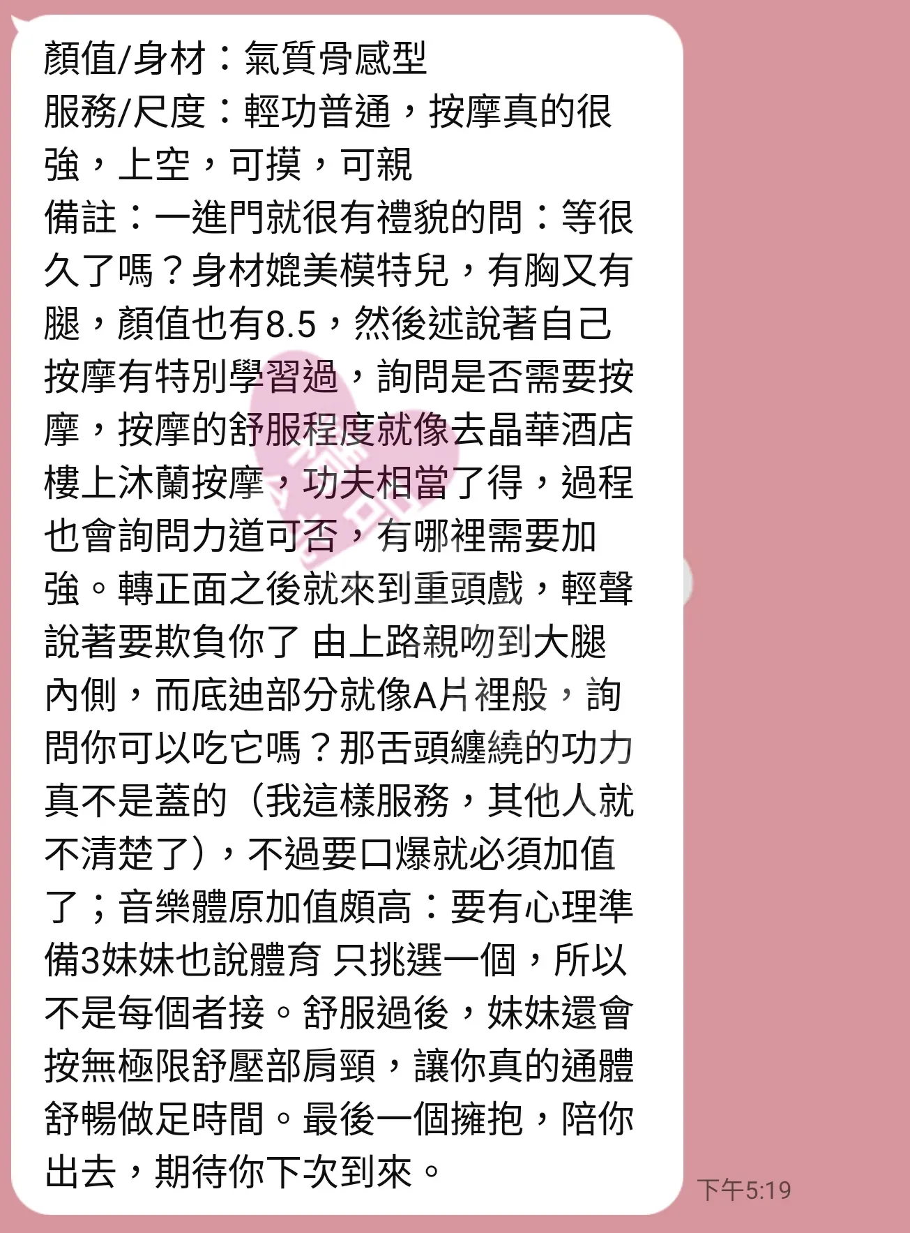 美容師都很有禮貌,先幫你背部按摩聊聊天,前戲會開始調情輕功,再來就是重點部位的加強。如果預算,也可以跟美容師聊聊加值服務,放心問都有機會。精品舒壓期待每位客人每次來舒壓都有個Happy Ending!