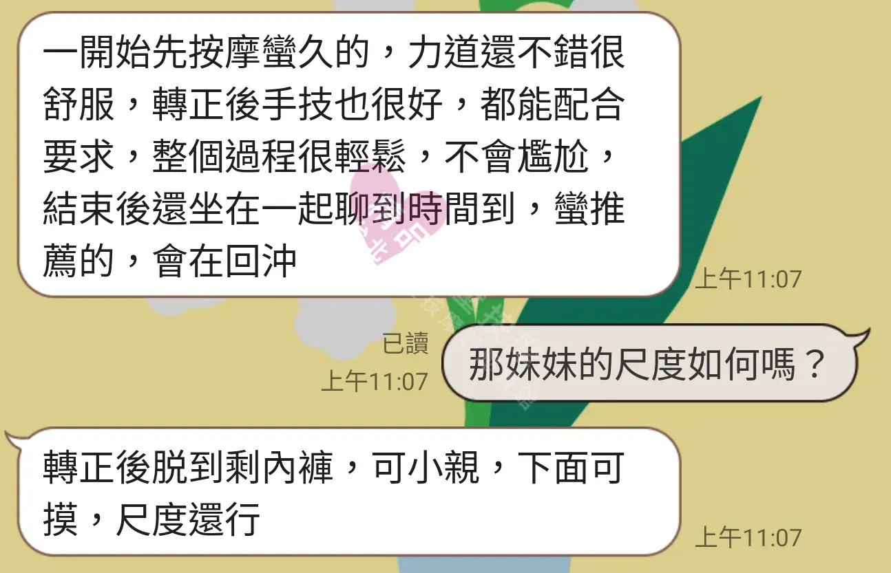 美容師都很有禮貌,先幫你背部按摩聊聊天,前戲會開始調情輕功,再來就是重點部位的加強。如果預算,也可以跟美容師聊聊加值服務,放心問都有機會。精品舒壓期待每位客人每次來舒壓都有個Happy Ending!