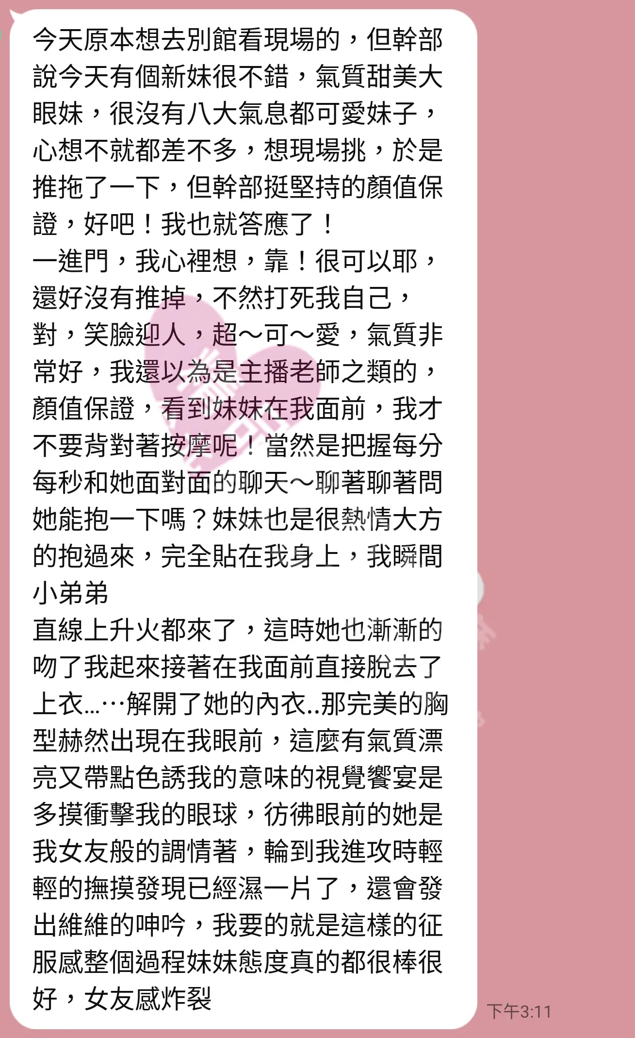 美容師都很有禮貌,先幫你背部按摩聊聊天,前戲會開始調情輕功,再來就是重點部位的加強。如果預算,也可以跟美容師聊聊加值服務,放心問都有機會。精品舒壓期待每位客人每次來舒壓都有個Happy Ending!