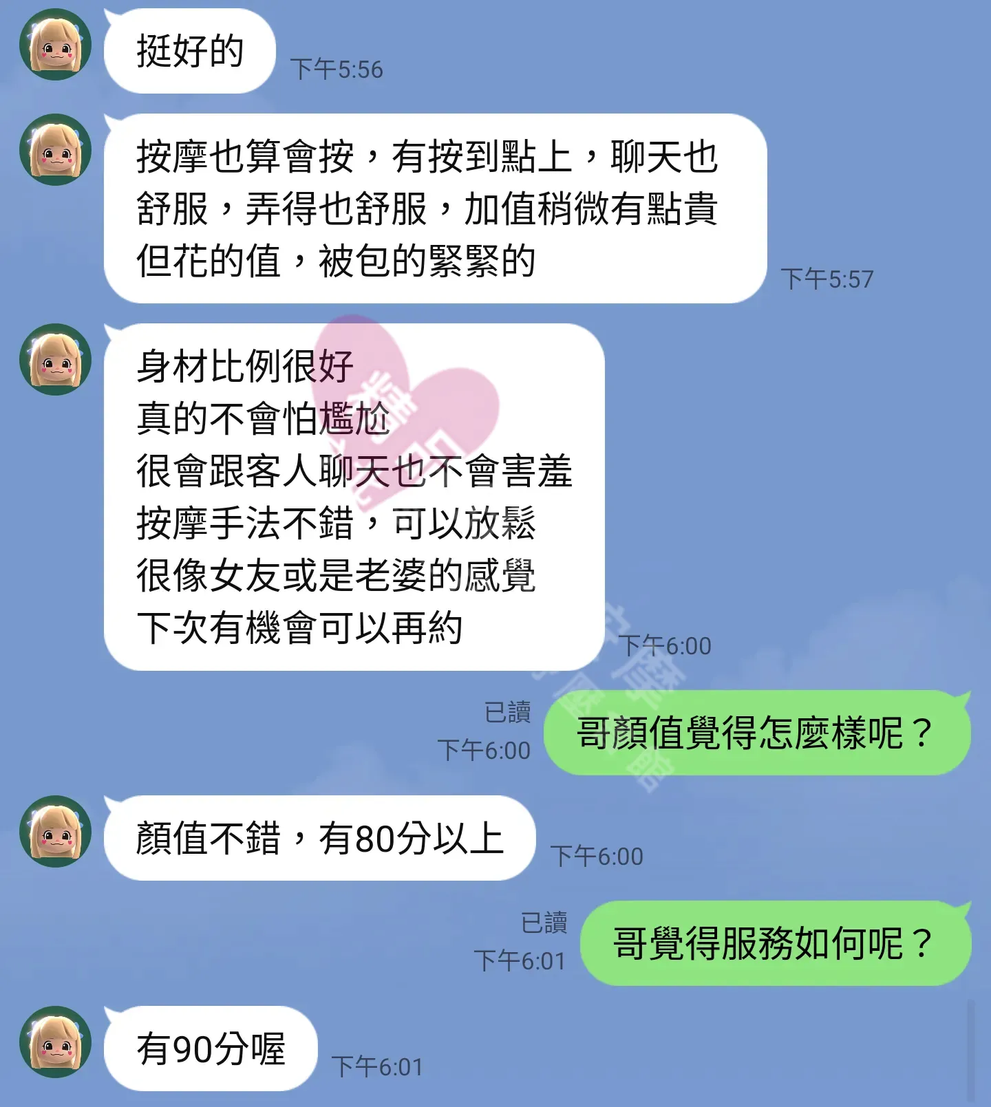 美容師都很有禮貌,先幫你背部按摩聊聊天,前戲會開始調情輕功,再來就是重點部位的加強。如果預算,也可以跟美容師聊聊加值服務,放心問都有機會。精品舒壓期待每位客人每次來舒壓都有個Happy Ending!