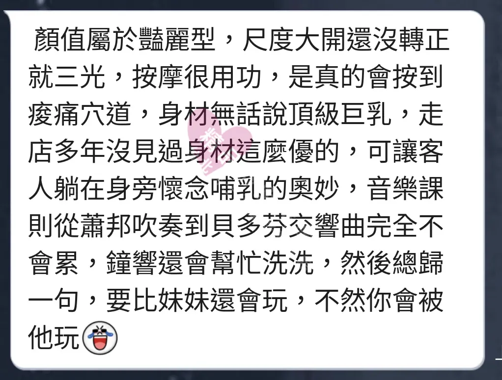 美容師都很有禮貌,先幫你背部按摩聊聊天,前戲會開始調情輕功,再來就是重點部位的加強。如果預算,也可以跟美容師聊聊加值服務,放心問都有機會。精品舒壓期待每位客人每次來舒壓都有個Happy Ending!