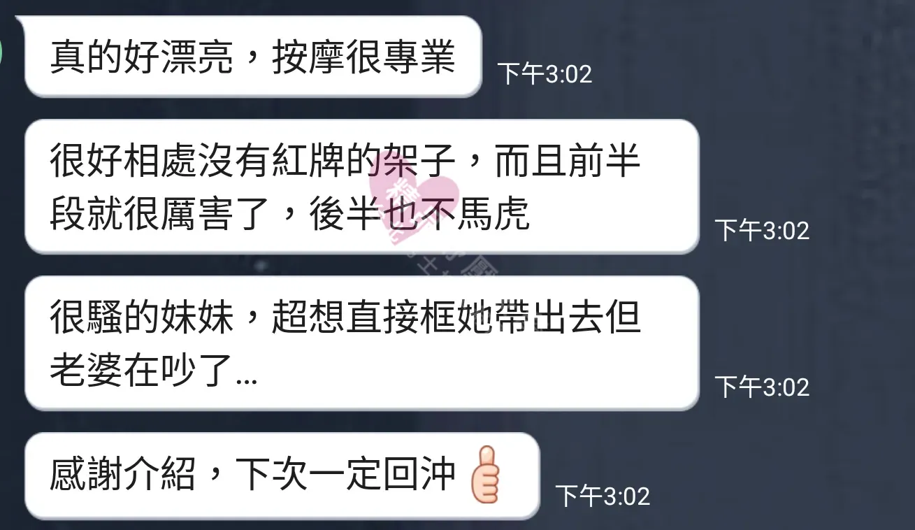 美容師都很有禮貌,先幫你背部按摩聊聊天,前戲會開始調情輕功,再來就是重點部位的加強。如果預算,也可以跟美容師聊聊加值服務,放心問都有機會。精品舒壓期待每位客人每次來舒壓都有個Happy Ending!